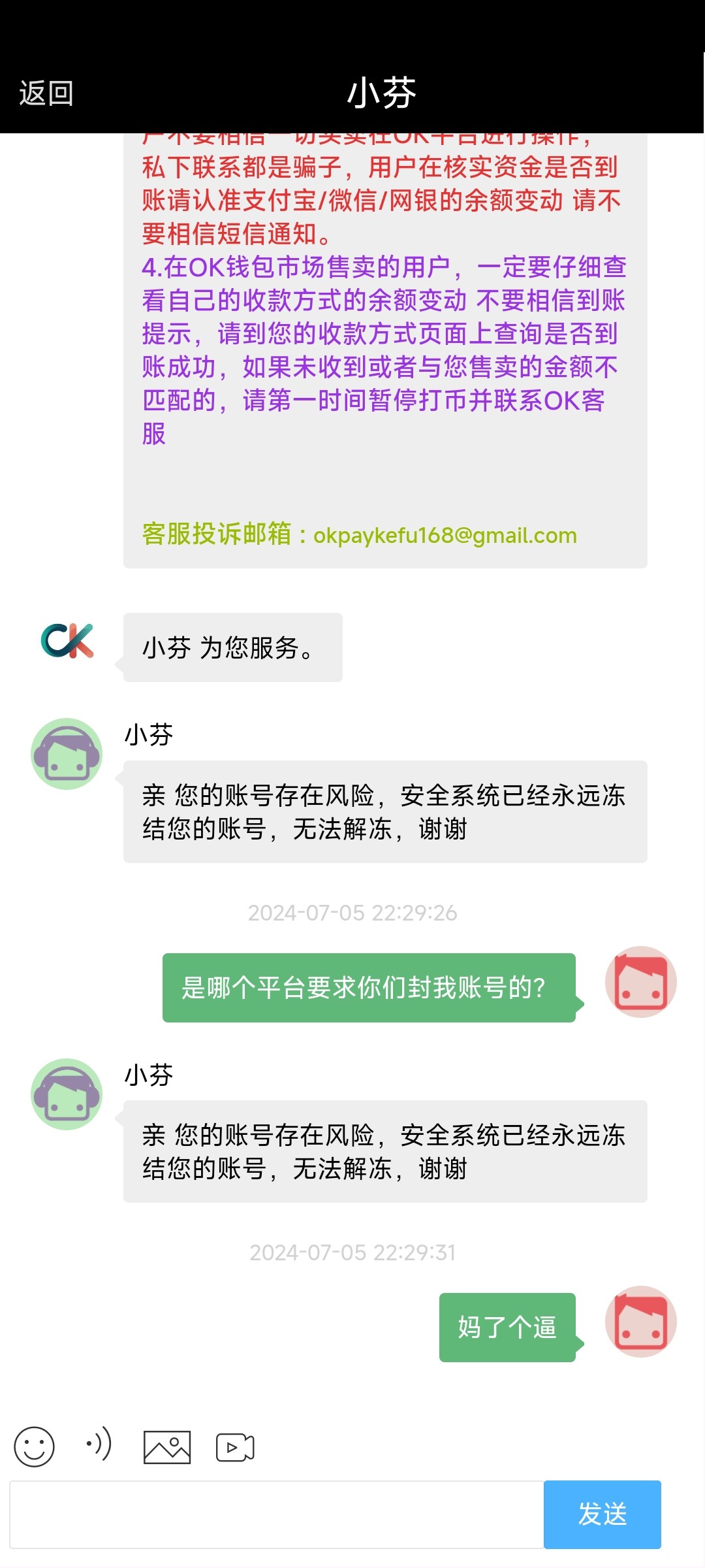 狗庄他爹 ▶ chimeng666 我之前也是这样不给解封,后来有个彩票狗推加我,说他们平台支持ok币,我说ok币封了不给用,他说小问题让我充值他帮我解决,后来解开了 2024-7-6