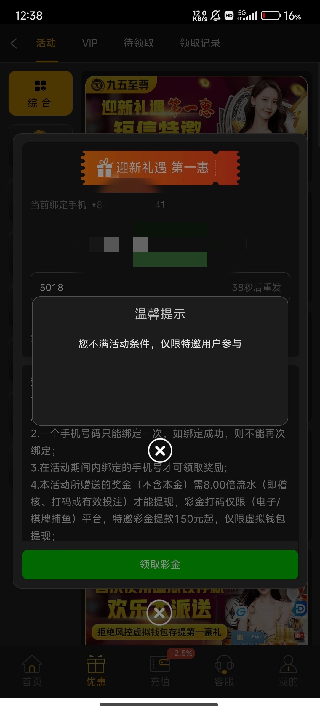收到短信注册账号去申请特邀彩金结果不在名单???