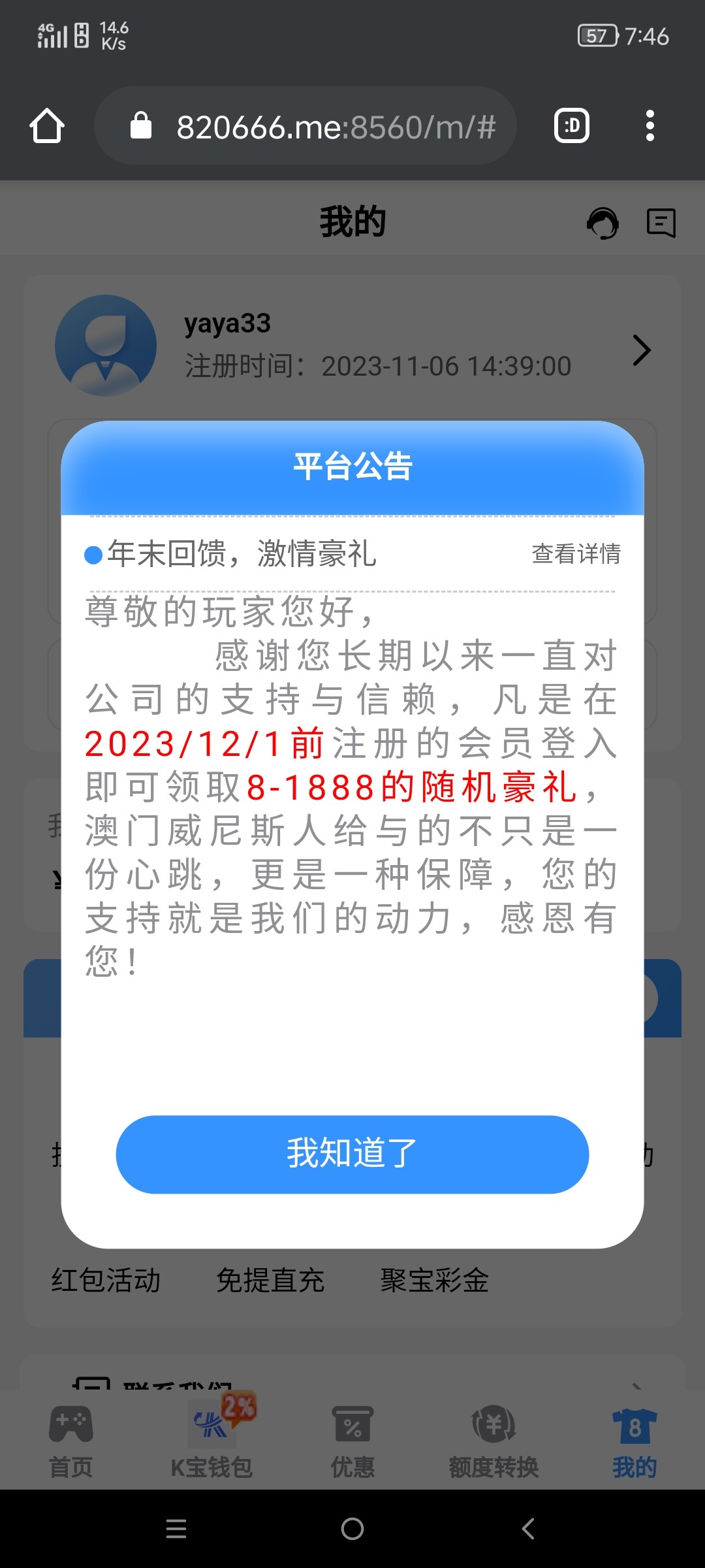 老用户专属活动,12月1号前注册的用户无需充值登录账号,自动有弹窗红包,出款自测!