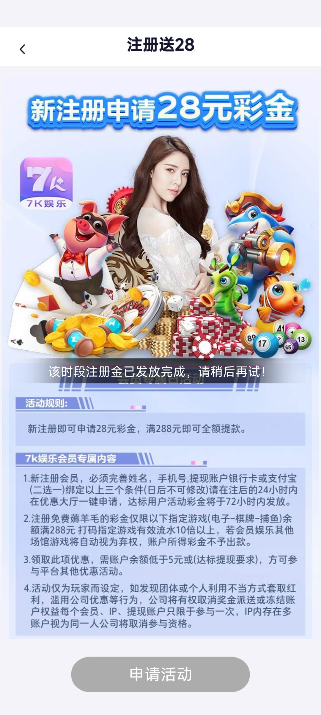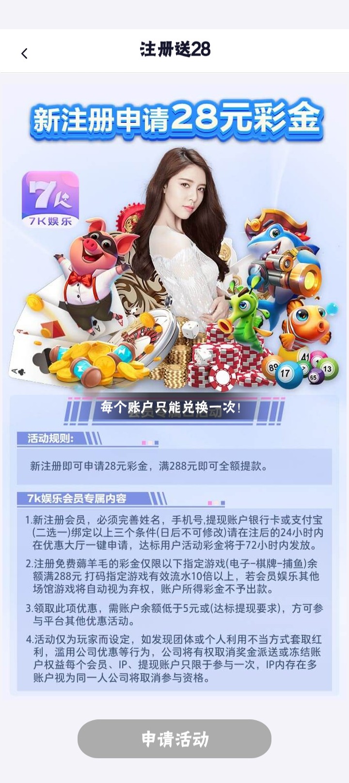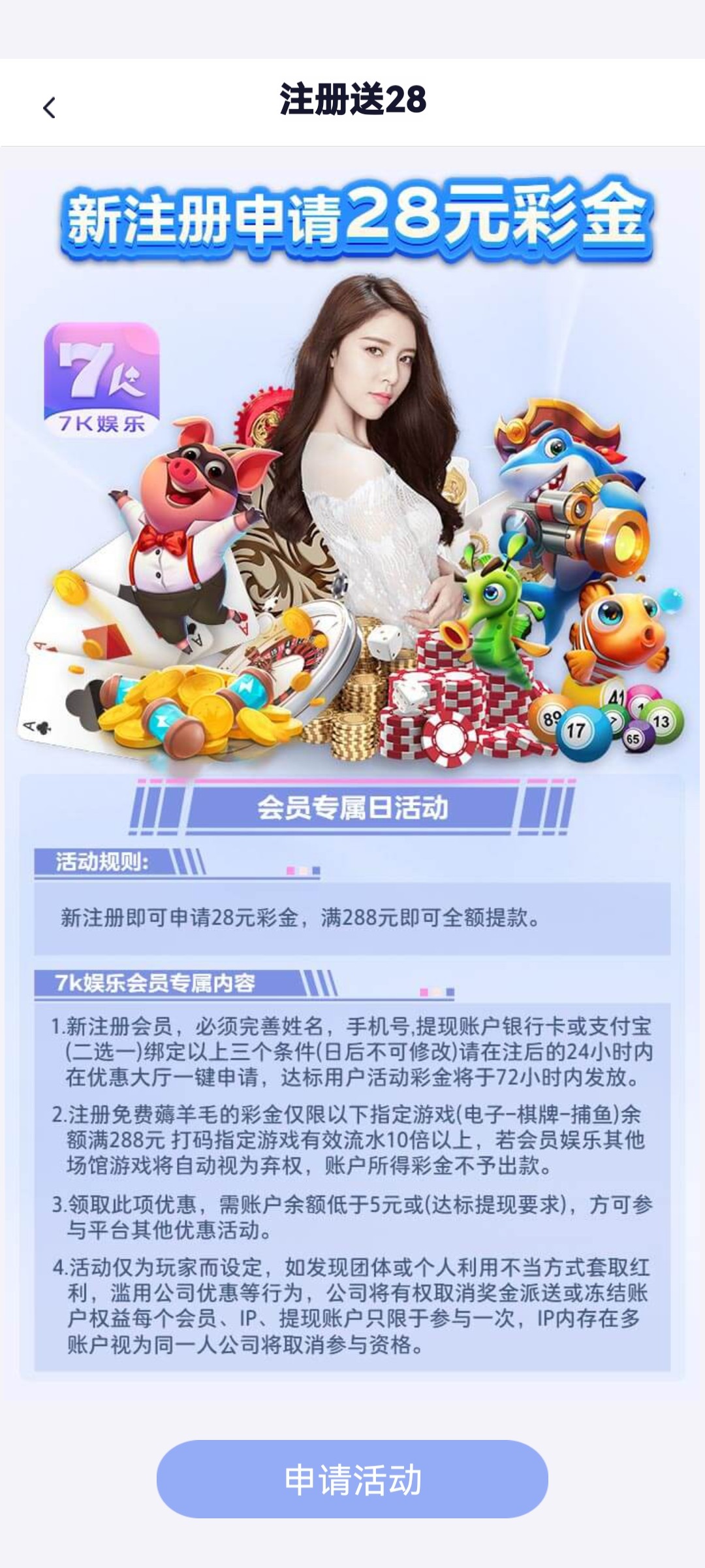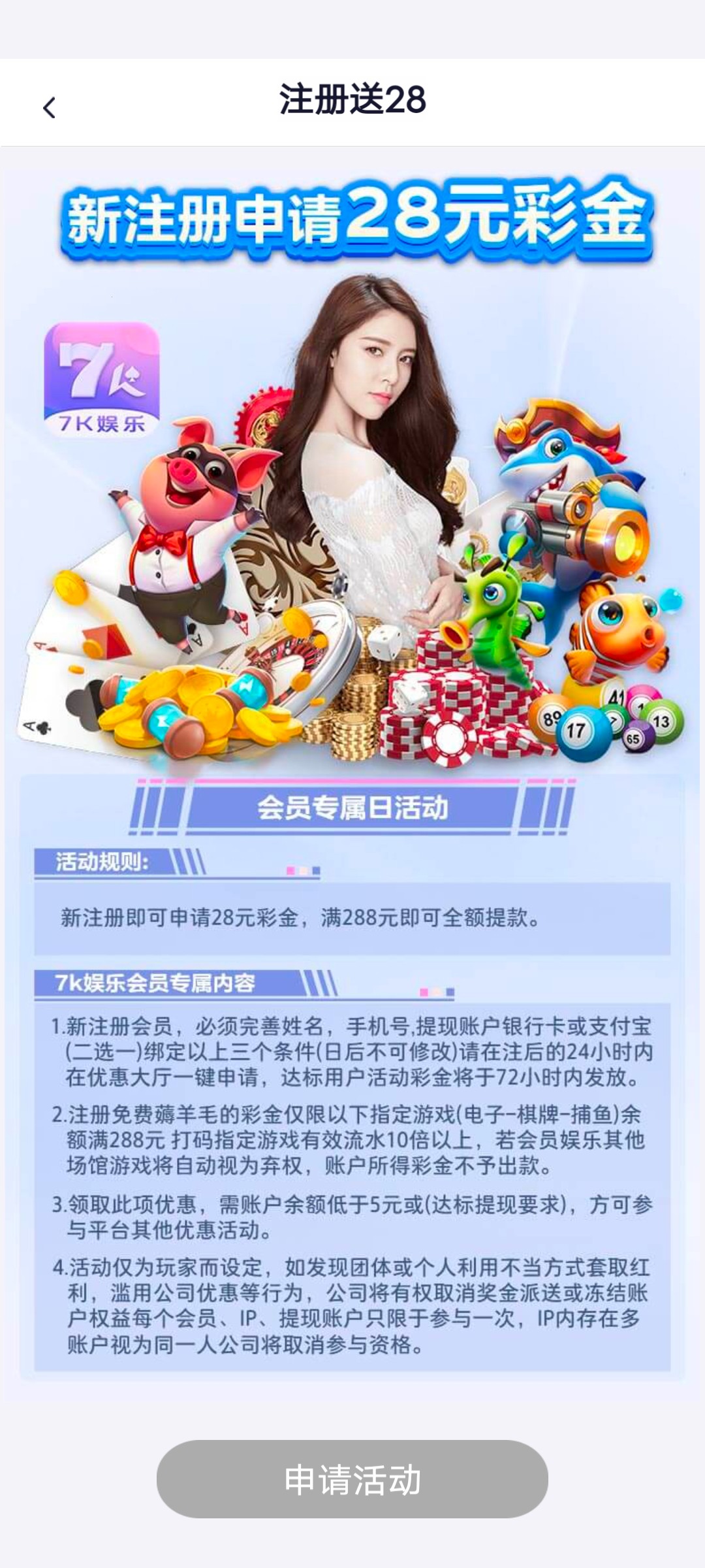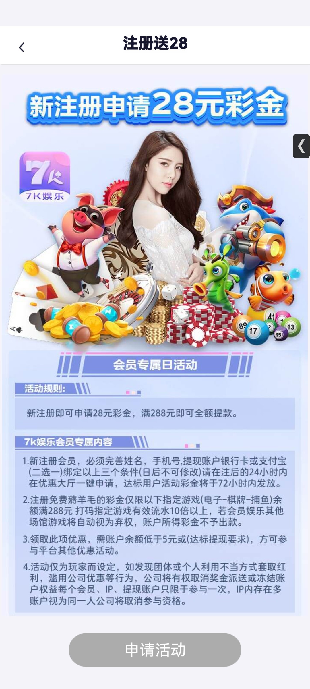 ✅新注册即可申请28彩金,满288即可提现