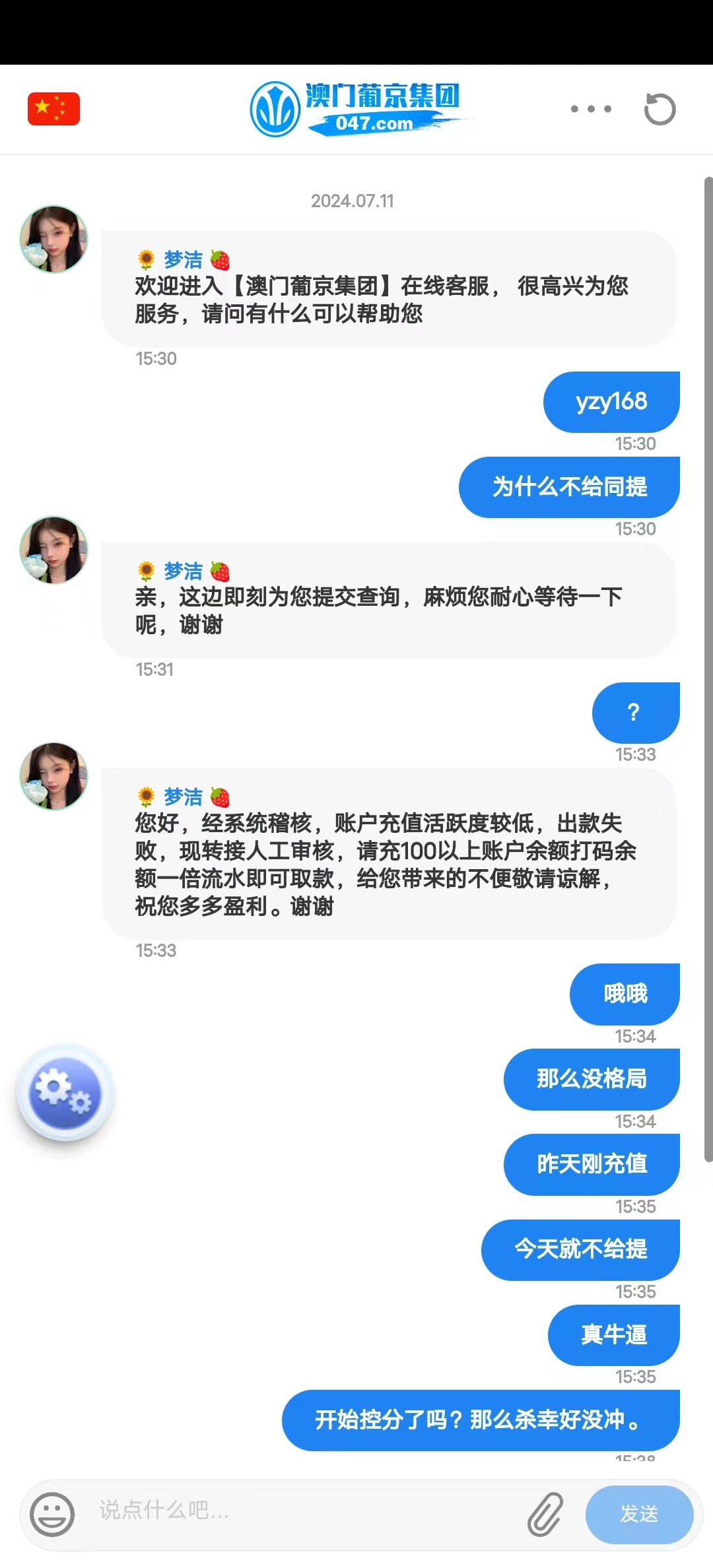 黑台昨天刚充值 今天不给提现