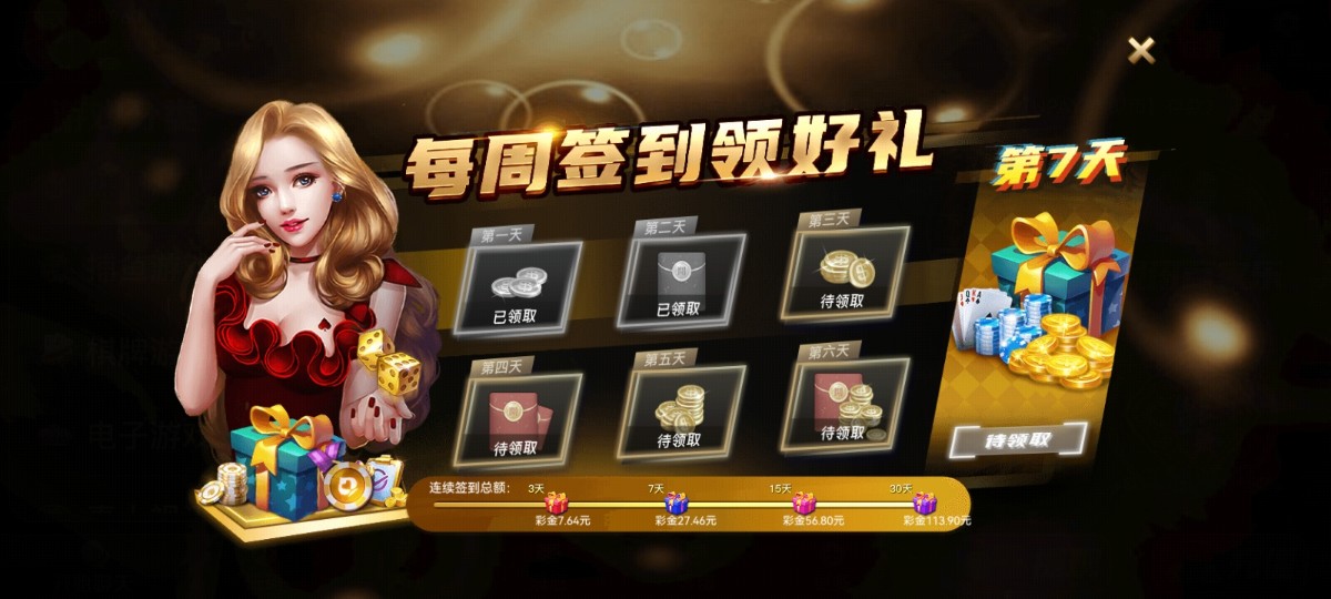 我这里有个一模一样的,也是签到送,满七天后,第八天又回到第一天的,而且不需要充值,我有一个号签到了一年一毛不充都照样能出款,你看看这个行不行哈