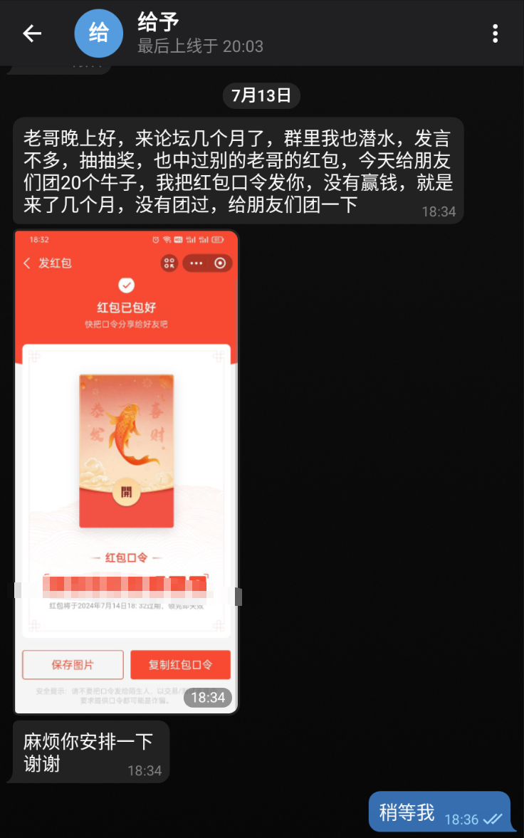 来自这位老哥的回团牛!,这位老哥来了几个月了,发言不多,但是承蒙社区的兄弟们照顾了,经常中奖牛子或烟,今天找到老哥想发个牛回团一下,稳
