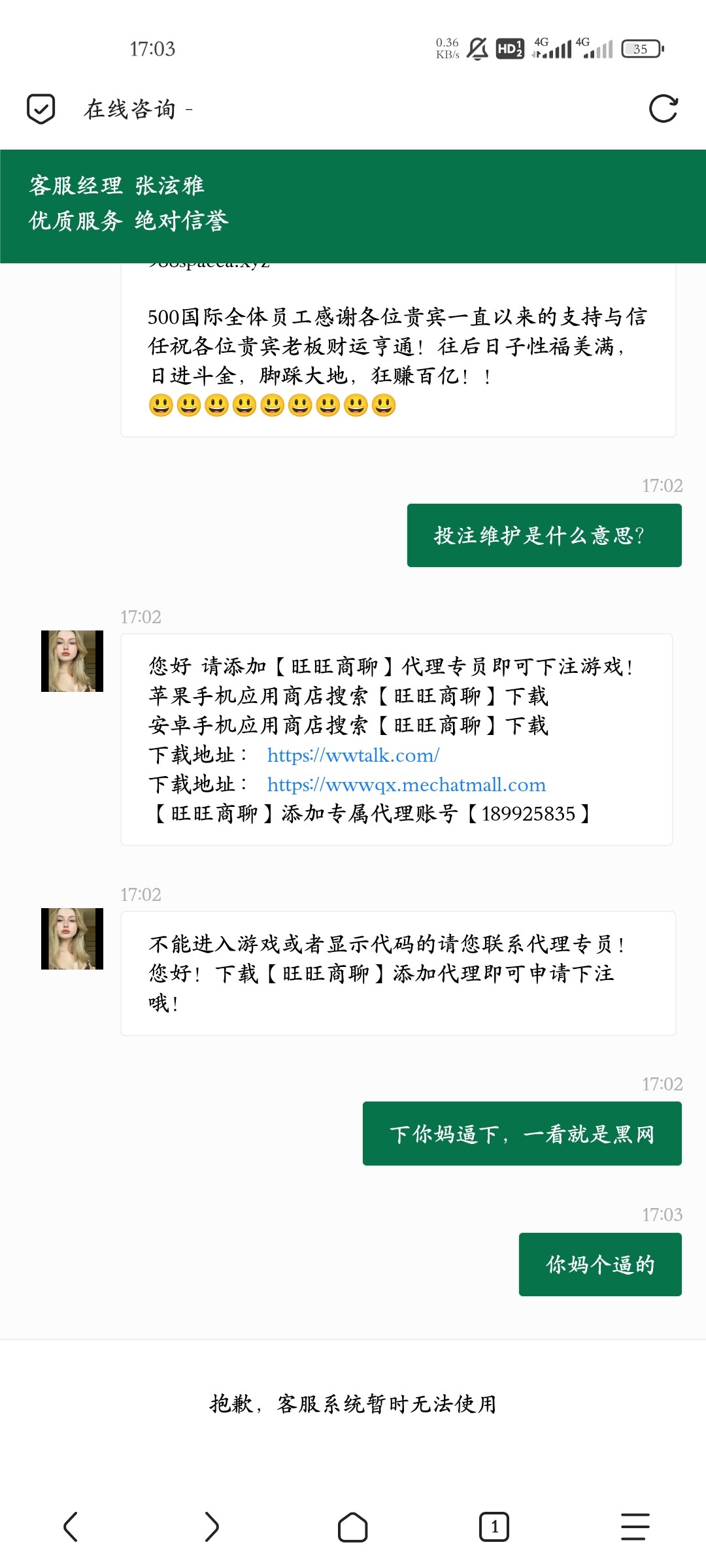这个500国际我记得当时注册送68不能玩游戏,去问他们客服,他叫我充值我没充。我骂了我就走了