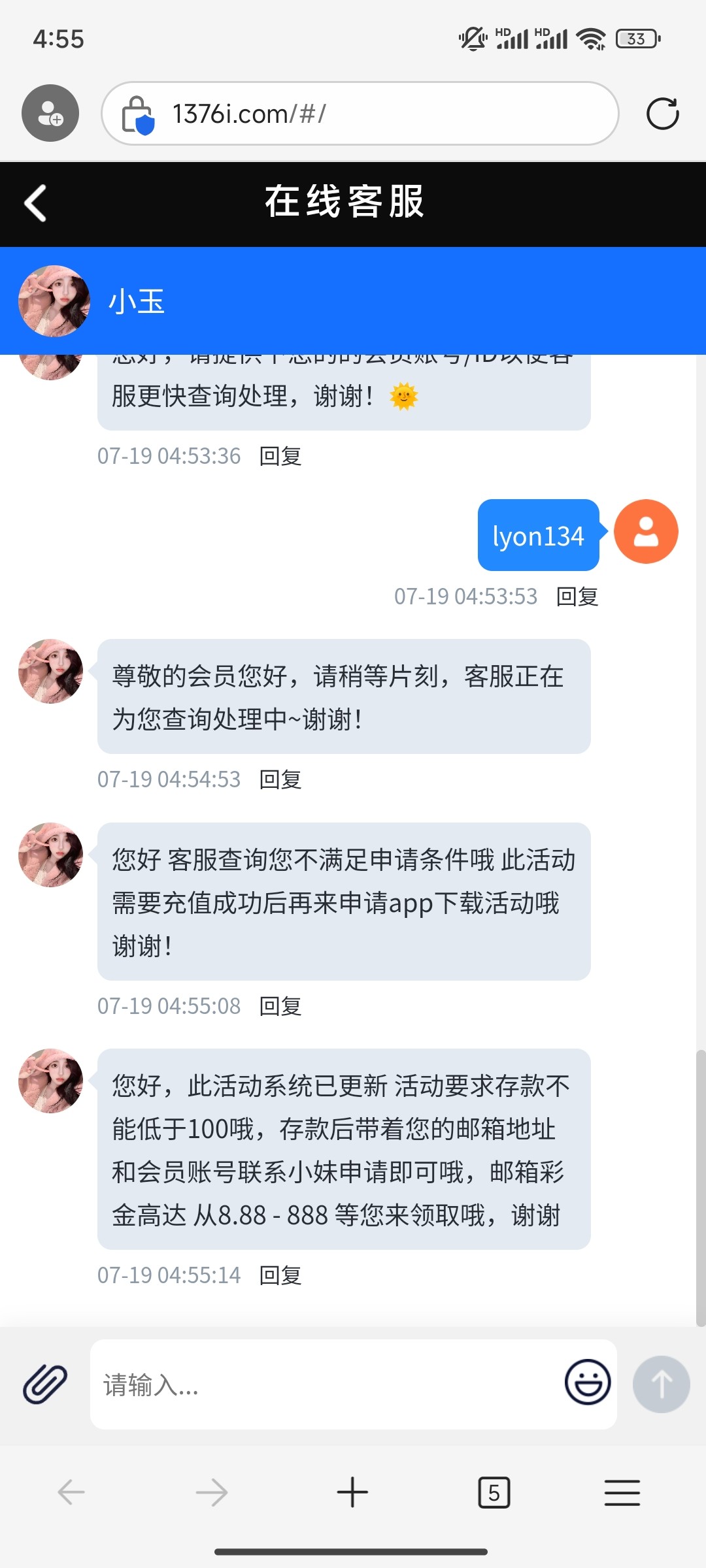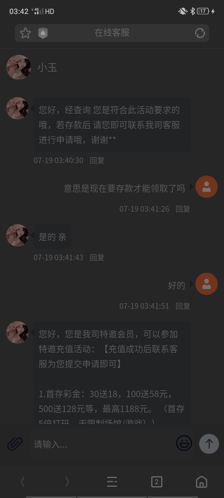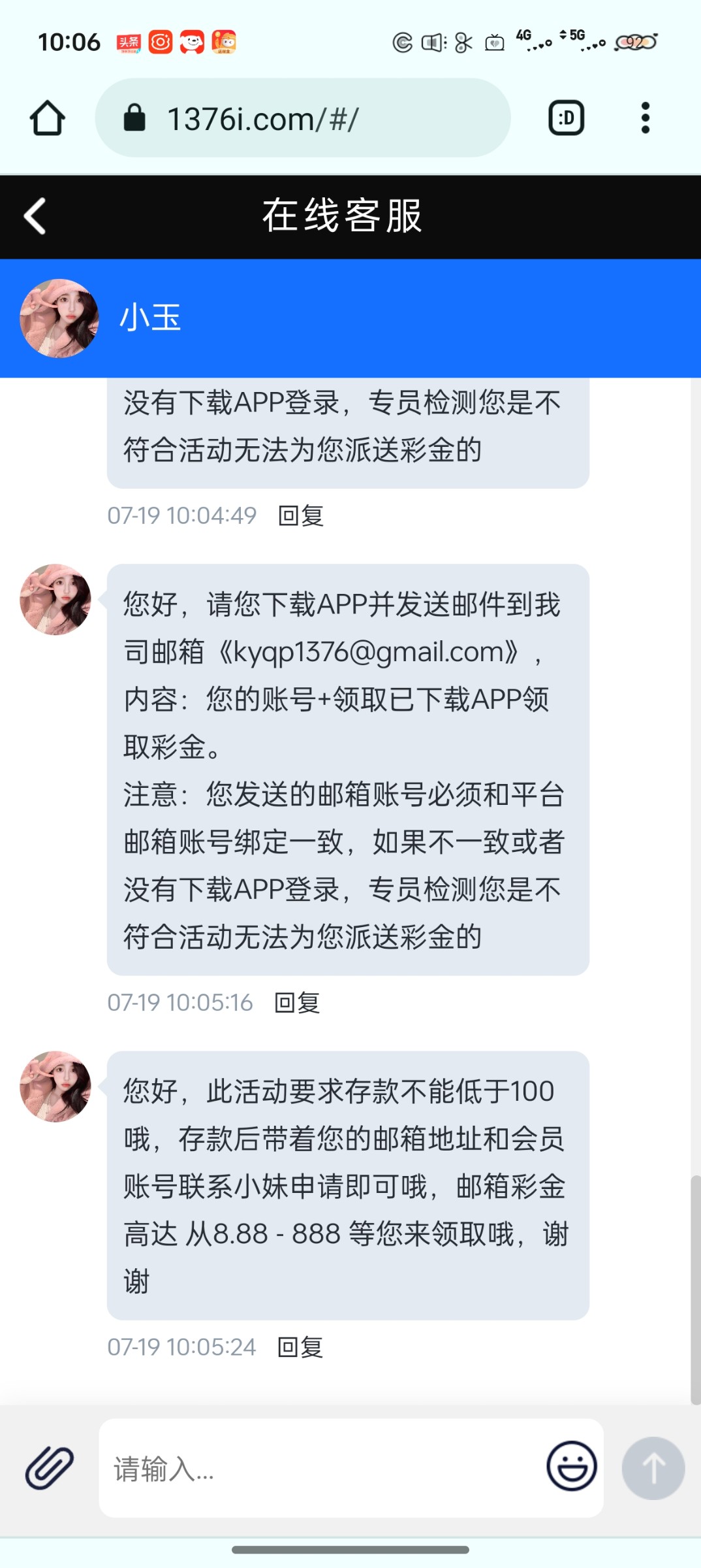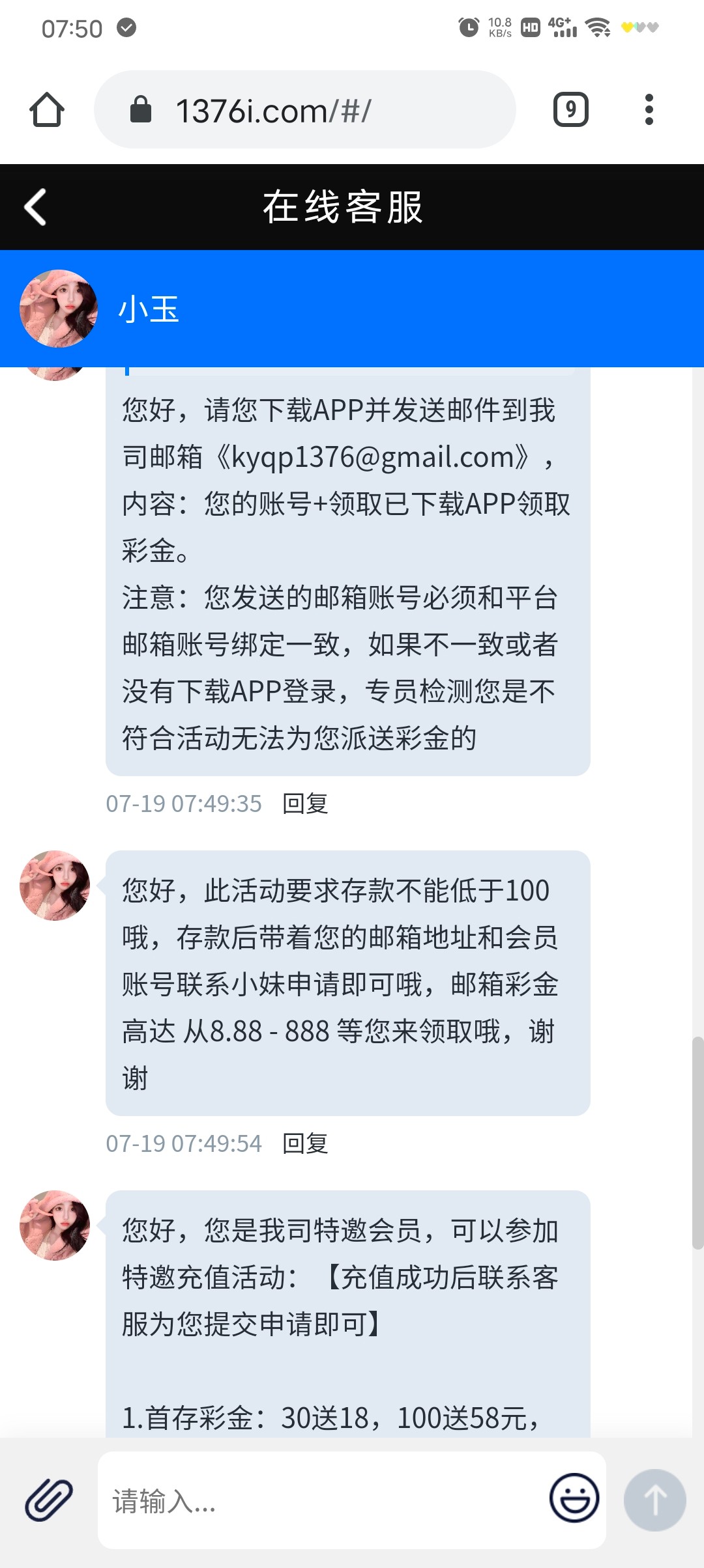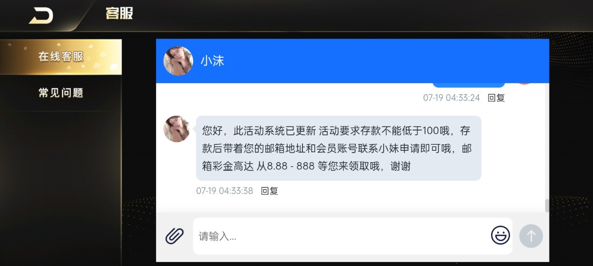 您好,此活动要求存款不能低于100哦,存款后带着您的邮箱地址和会员账号联系小妹申请即可哦,邮箱彩金高达 从8.88 - 888 等您来领取哦,谢谢