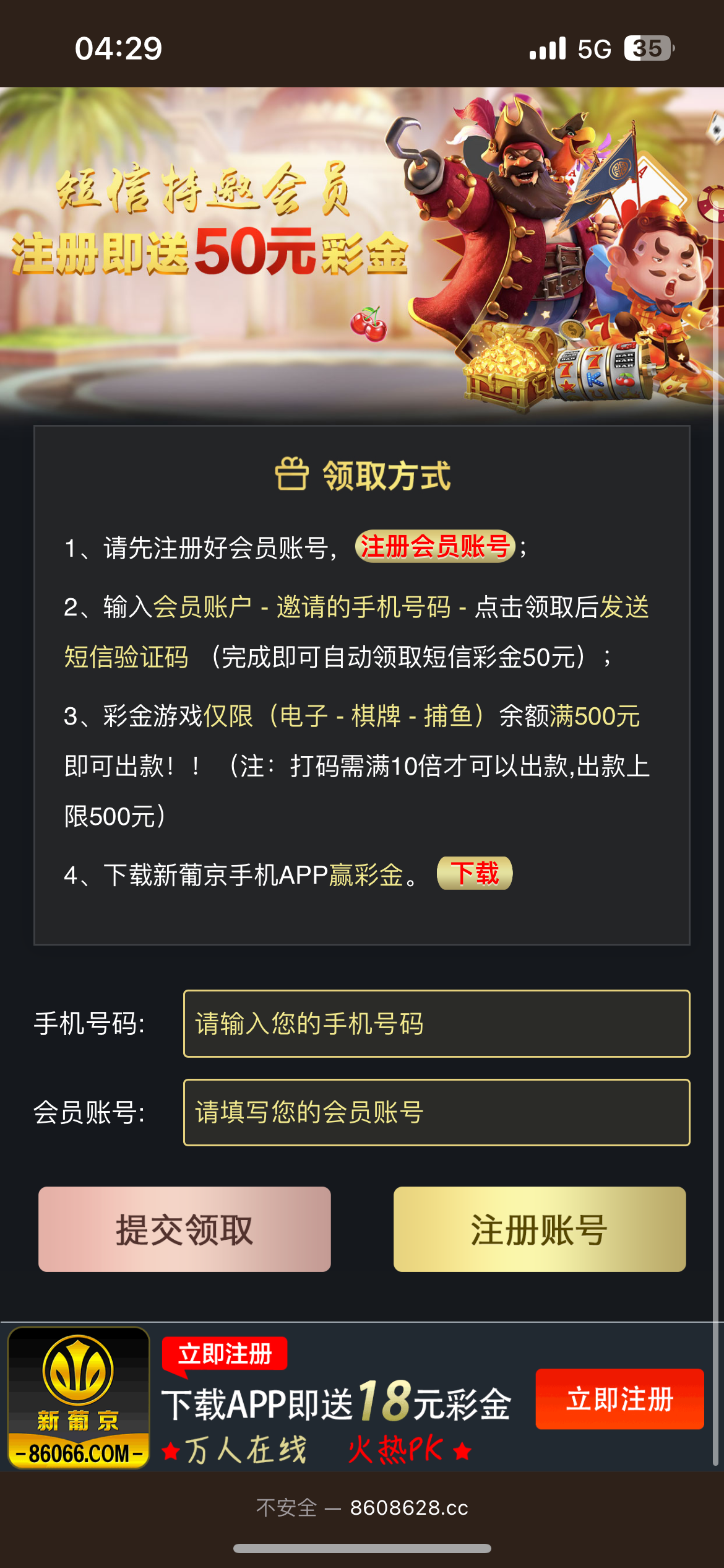 短信特邀送五十。先注册账号再去发短信申请。亲测两个号都收到了没打出来。不要充值纯白嫖。出款未知