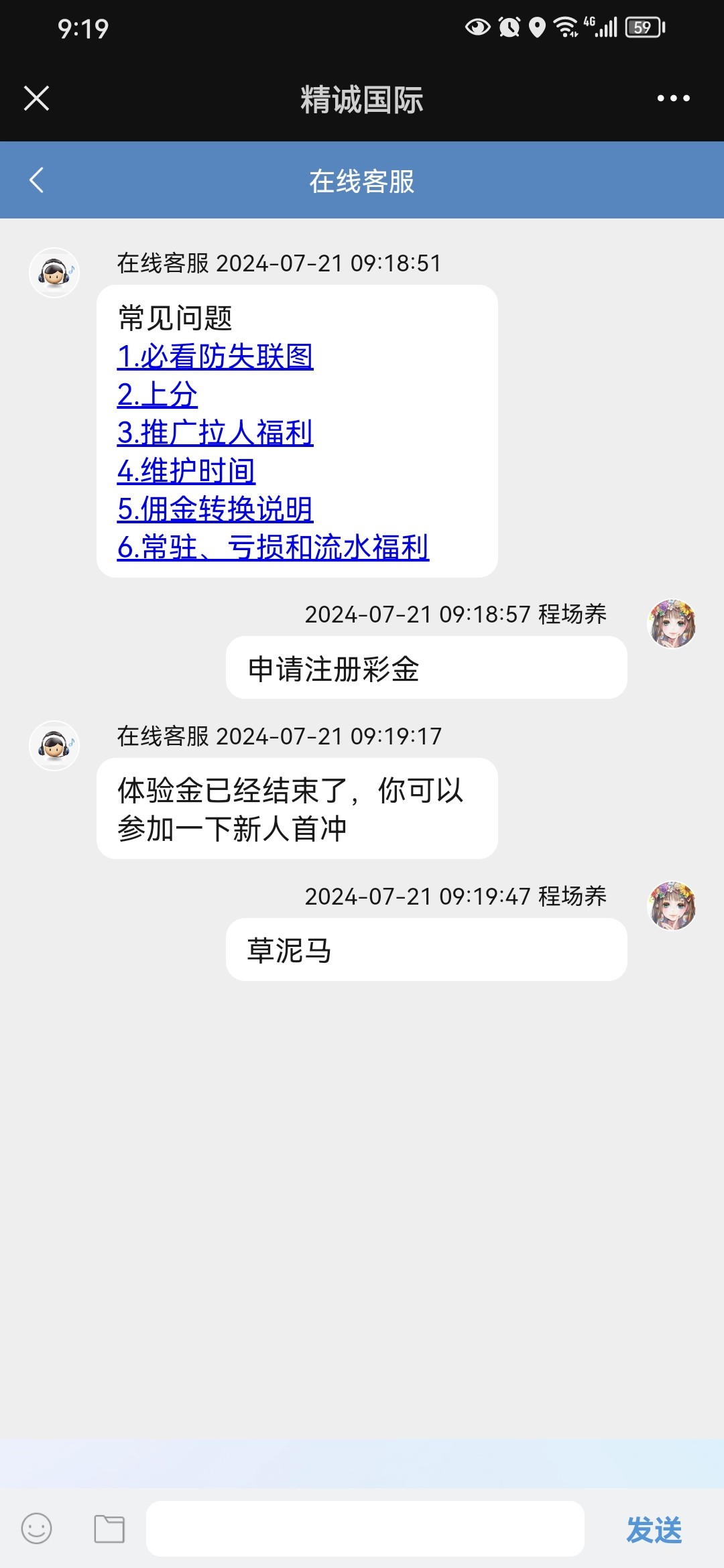 领取找在线客服发送领取体验金人有点多客服回复有点慢,耐心等待
