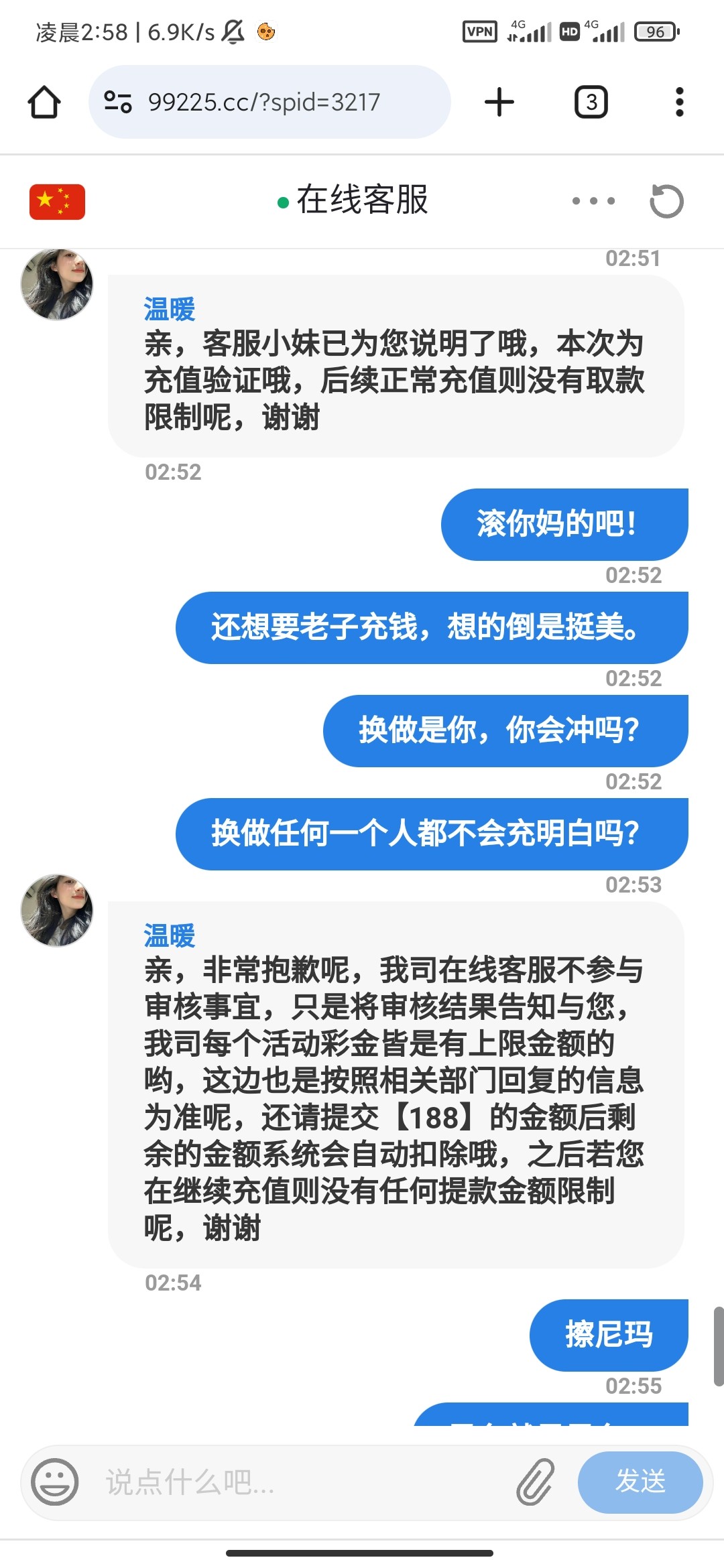 昨天刚充值了100,然后今天晚上签到彩金,打了300,提现说需要充值100打三倍流水,打了我整整一个晚上,后面只能提现188太黑了。