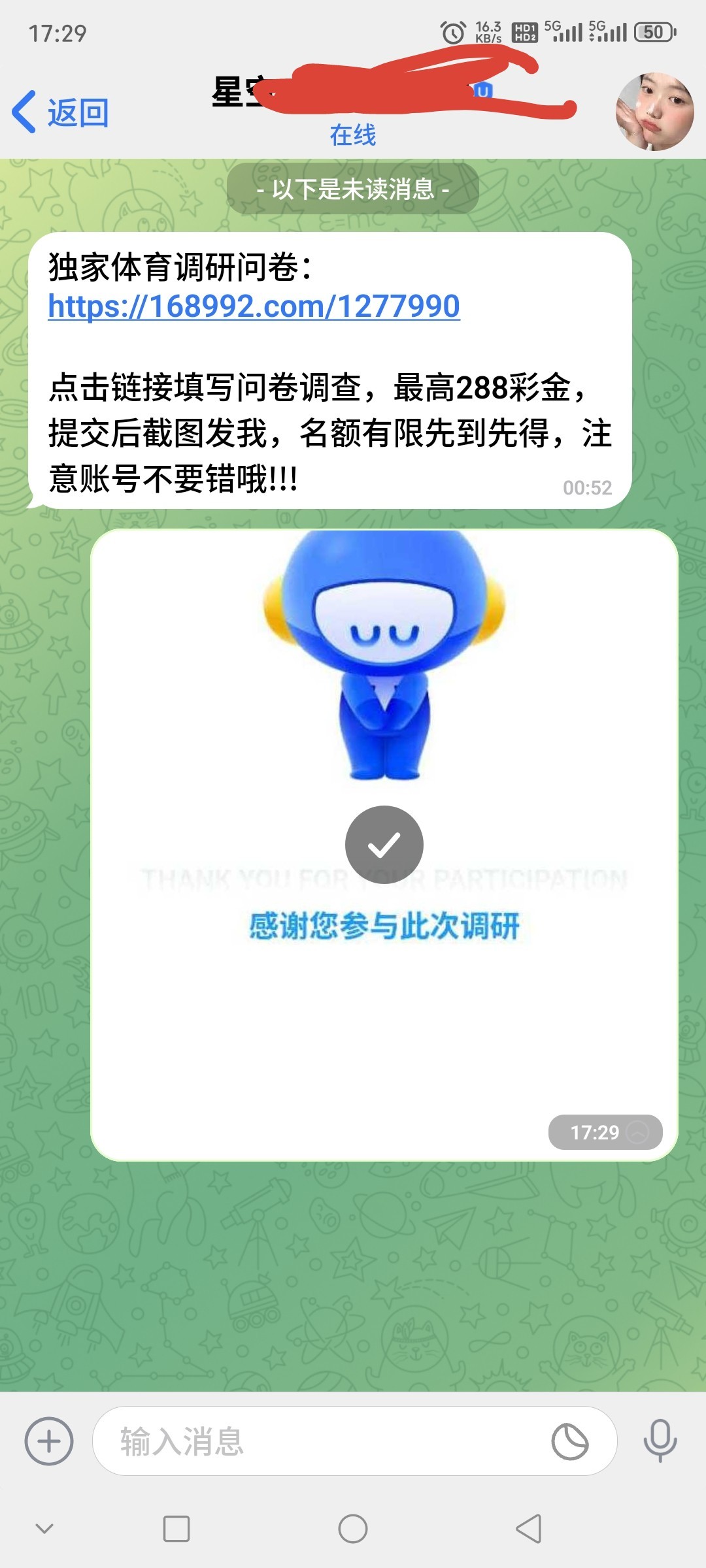 问卷调查一般在app里面有私信通知,没有可以问客服要他们的qt专属客服联系方式下载qt软件自己问一下客服有没有:xingkong.com