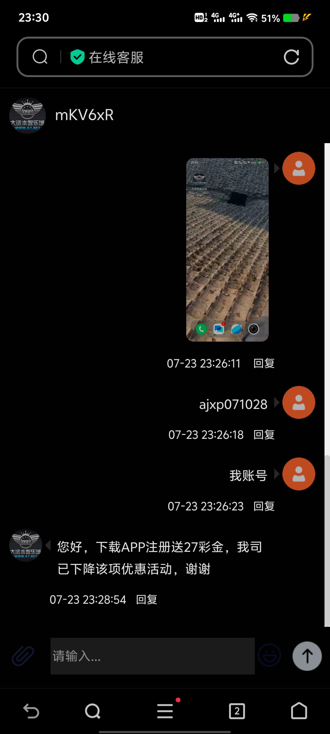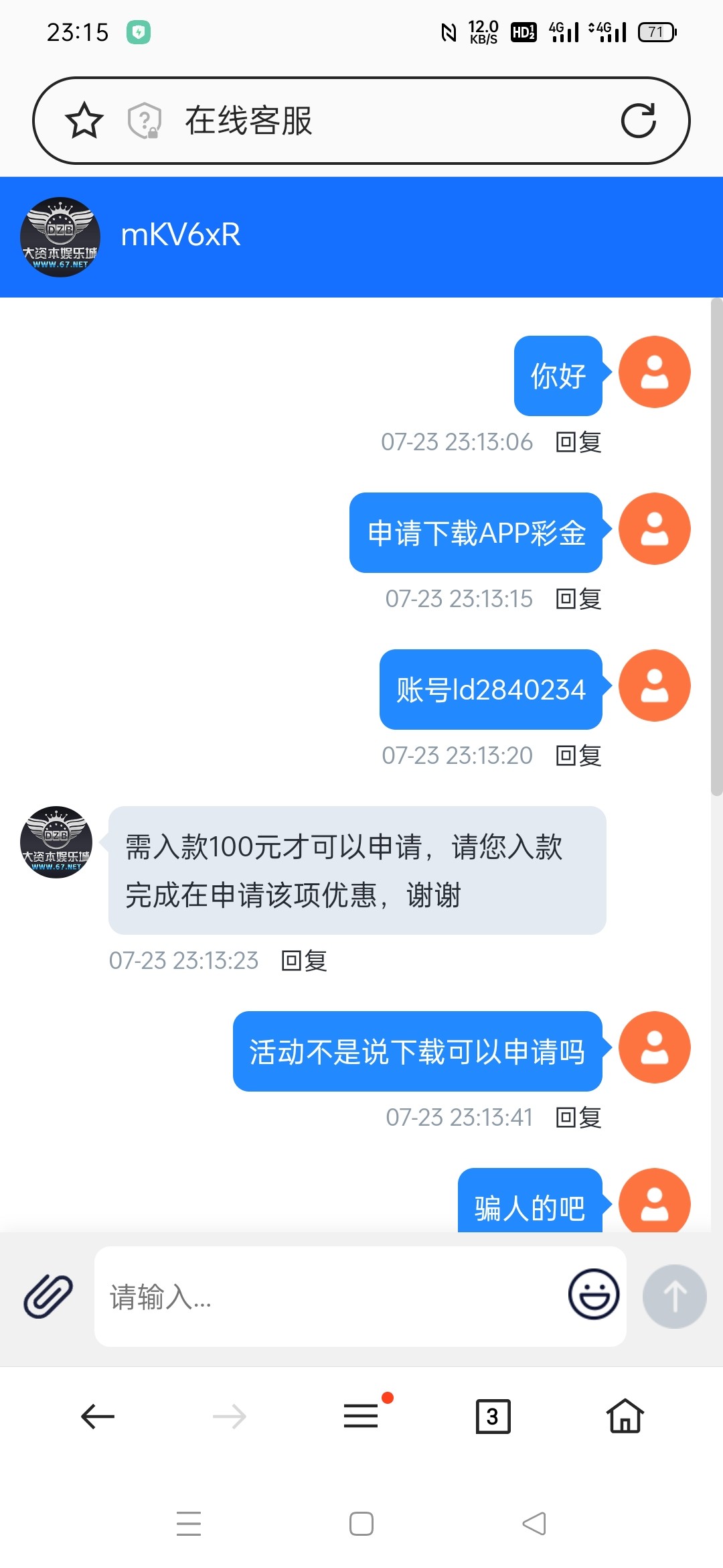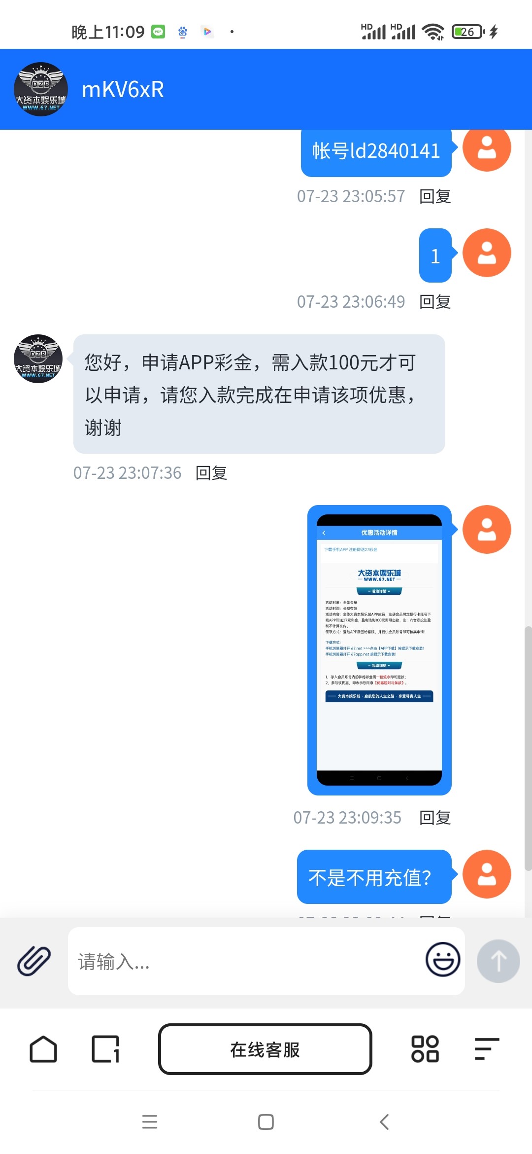 一直刷新客服就进去,但是要充值100才送了