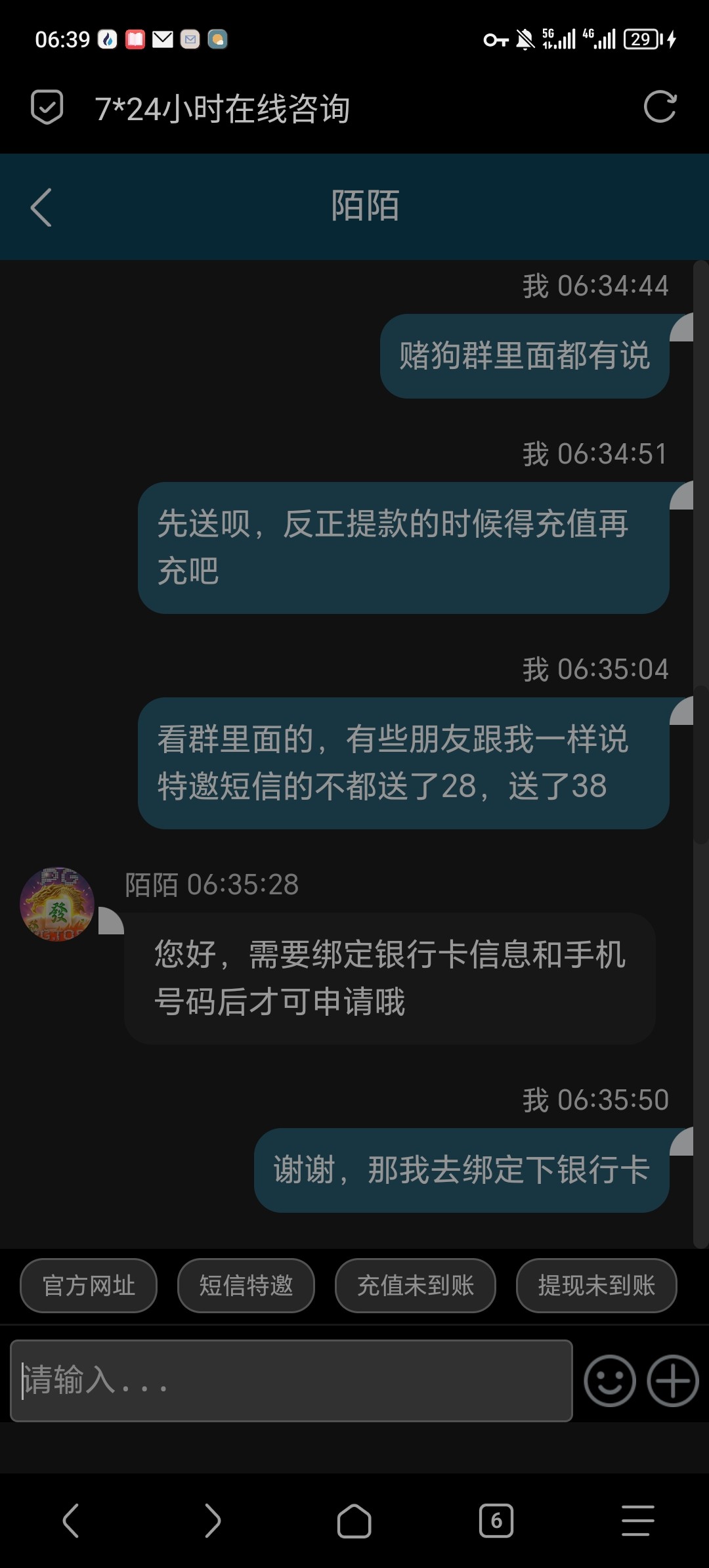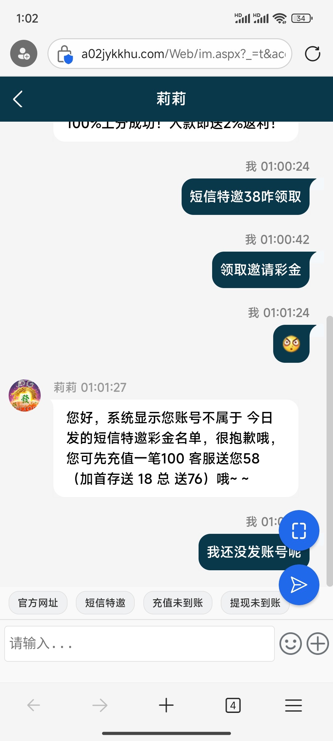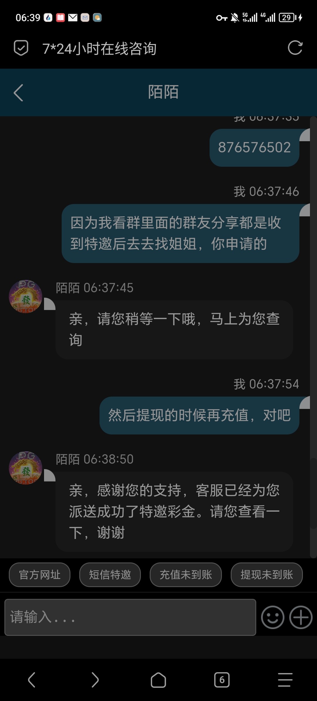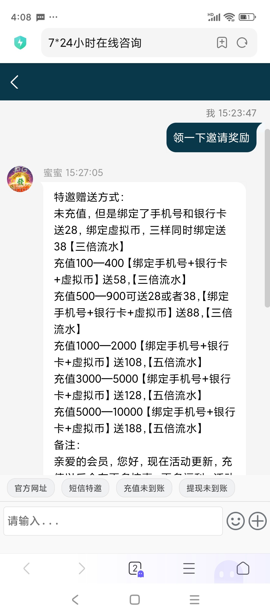 这个天天发短信去问就是充值,那天去直接说领取彩金就送了,两个号都送了,不要直接说短信特邀,直接说派发一下彩金这样会很稳的