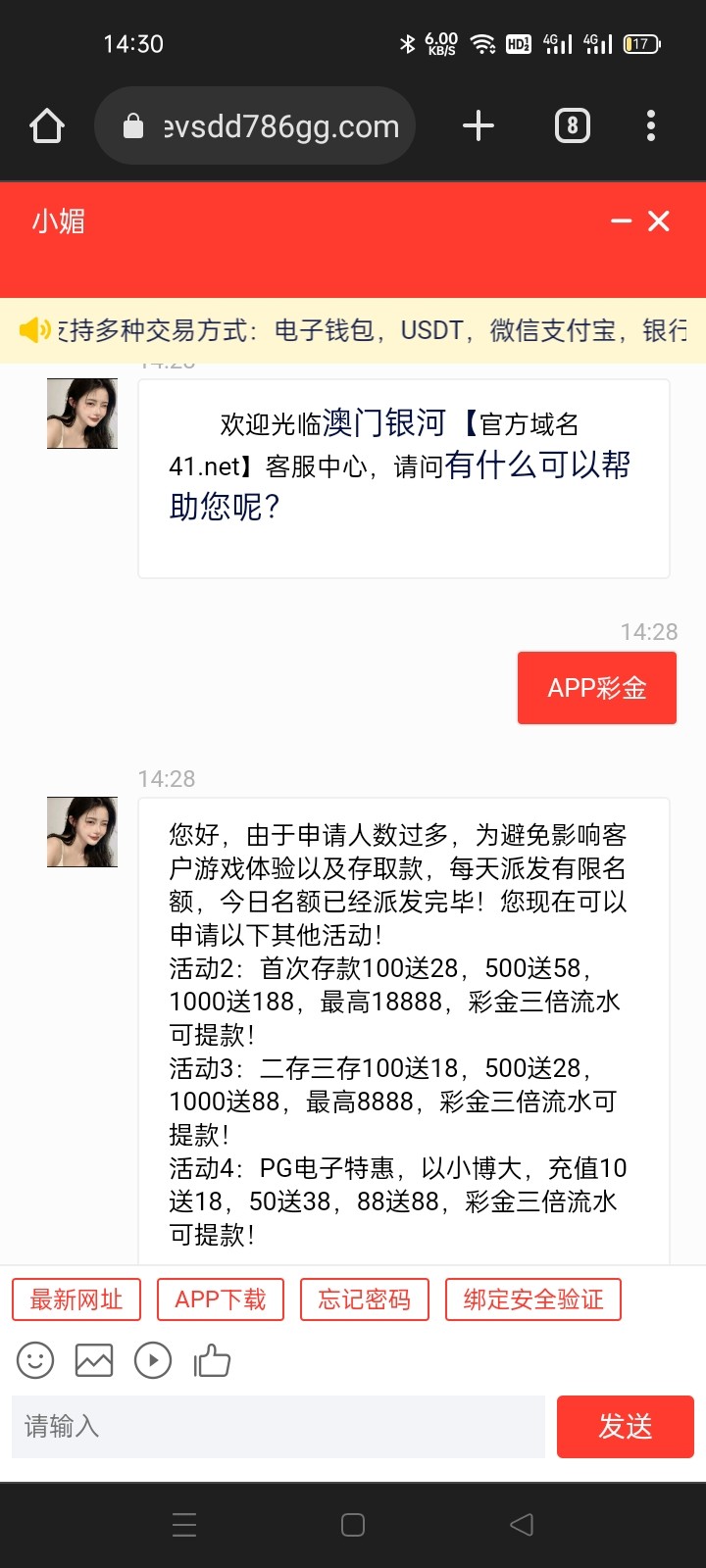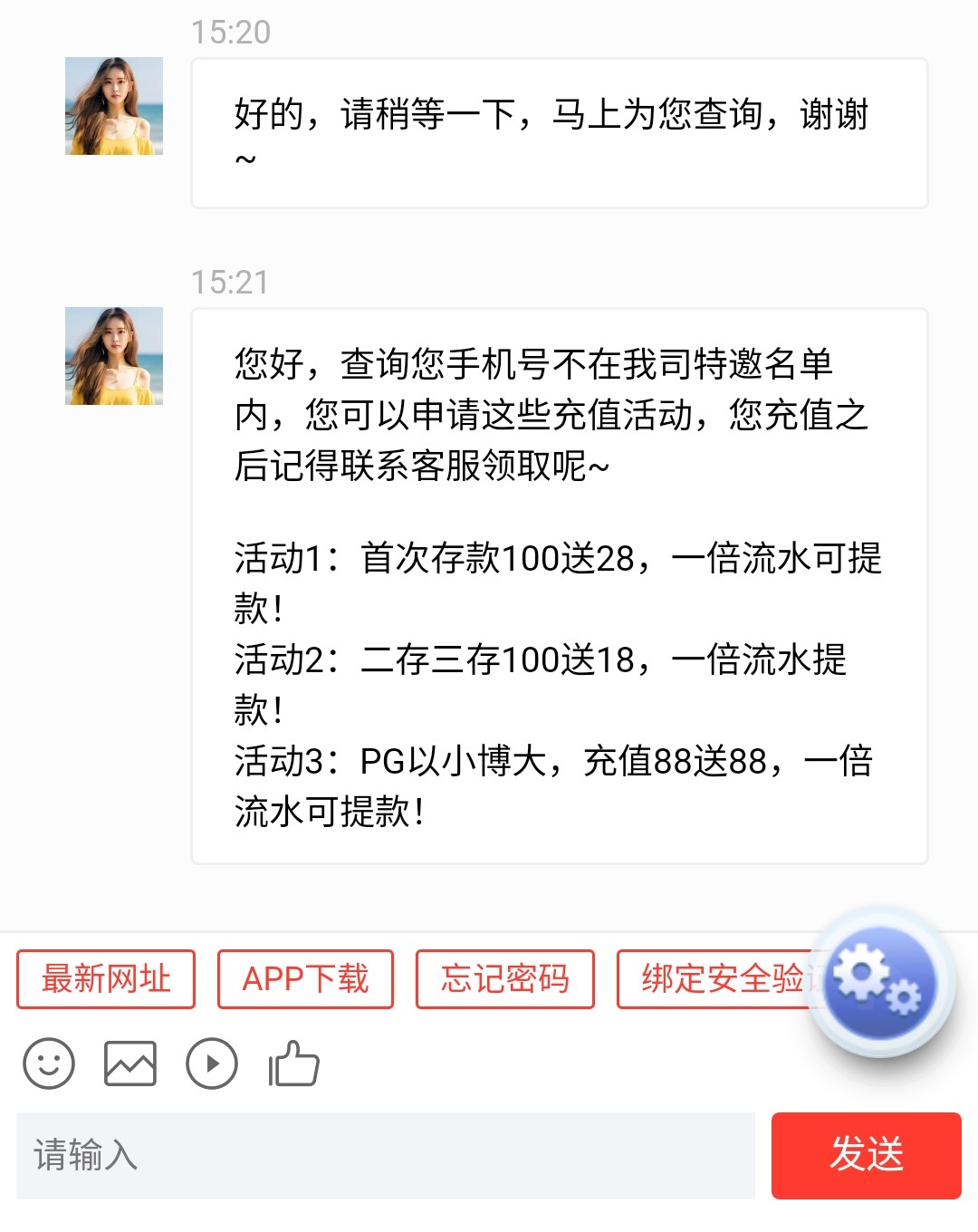 您好,由于申请人数过多,为避免影响客户游戏体验以及存取款,每天派发有限名额,今日名额已经派发完毕!您现在可以申请以下其他活动!活动1:首次存款100送28,最高可领18888元,一倍流水可提款!活动2:二存三存100送18,最高可领8888元,一倍流水提款!活动3:PG以小博大,充值10送18,50送38,88送88,指定金额提款!~~