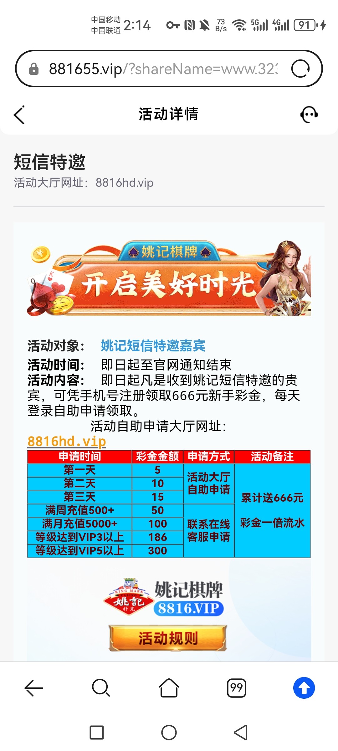 有收到短信的可以去了,姚记棋牌,第一天5,第二天10,第三天15,网址 www.3232.ooo 申请网址 8816hd.vip