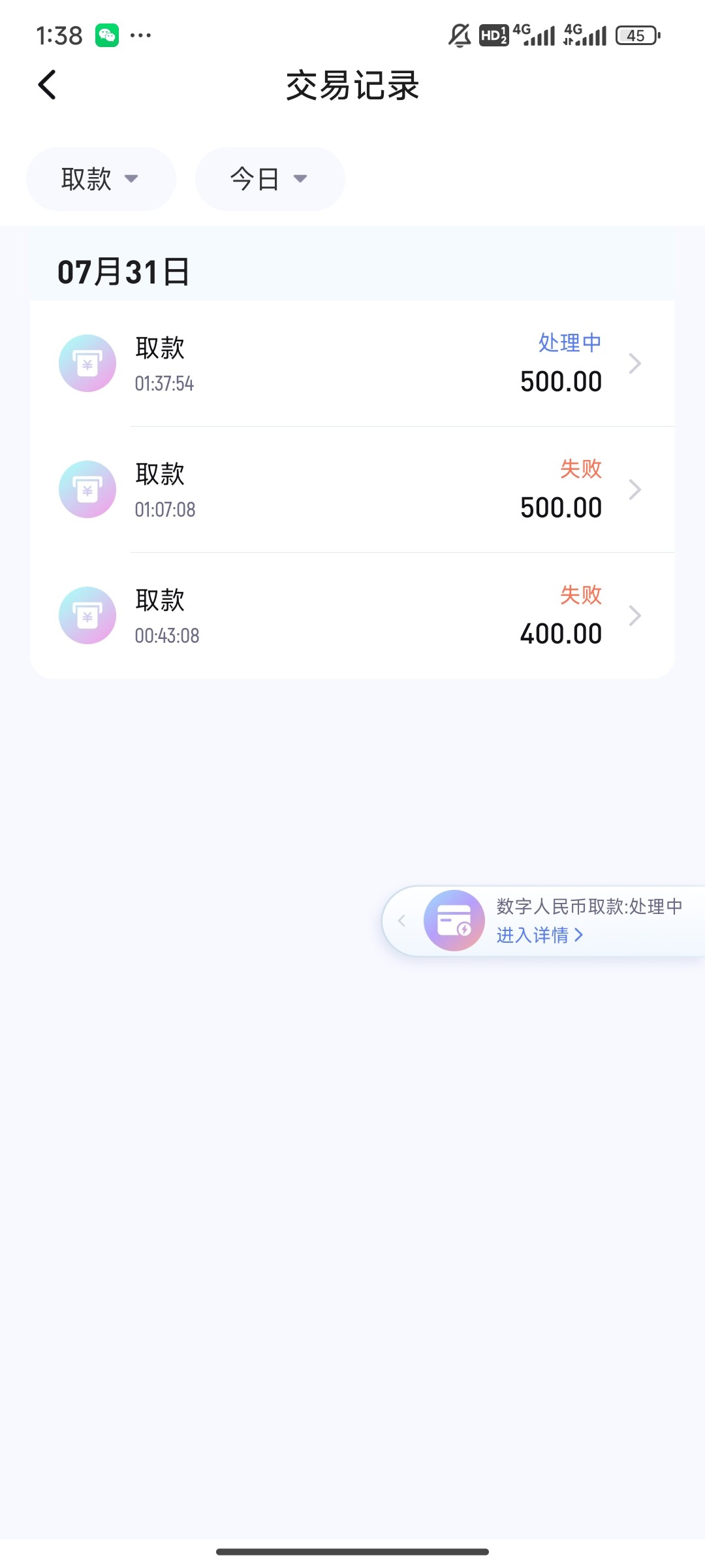 我tm想死了,提了两次,第一次银行卡我电子卡不能收款然后取消了,第二次支付宝那边扫码风控直接支付宝限制了,现在提第三次数字人民币,再不行我真哭了