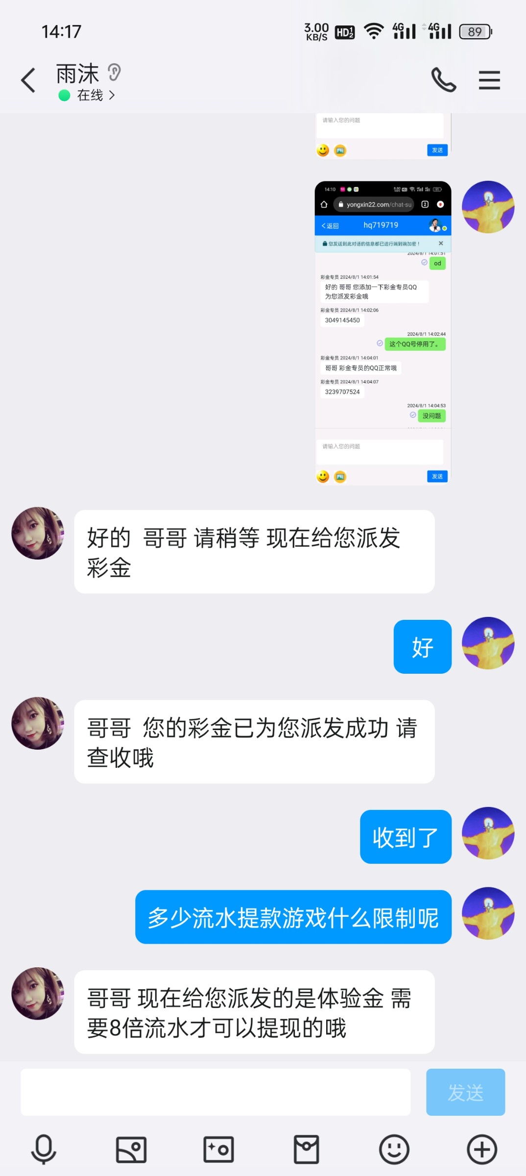 电话彩金,注册联系彩金专员,会让你加彩金专员QQ,也可以直接加qq专员,要客服聊天截图申请,碰瓷试试 地址yongxin22.com