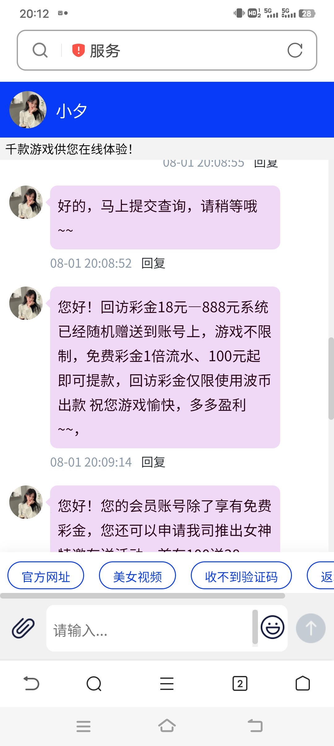 老用户接到电话,下载app登录后,找客服报上手机号与id,说电话彩金,就送了28。下载网址: 6261.app