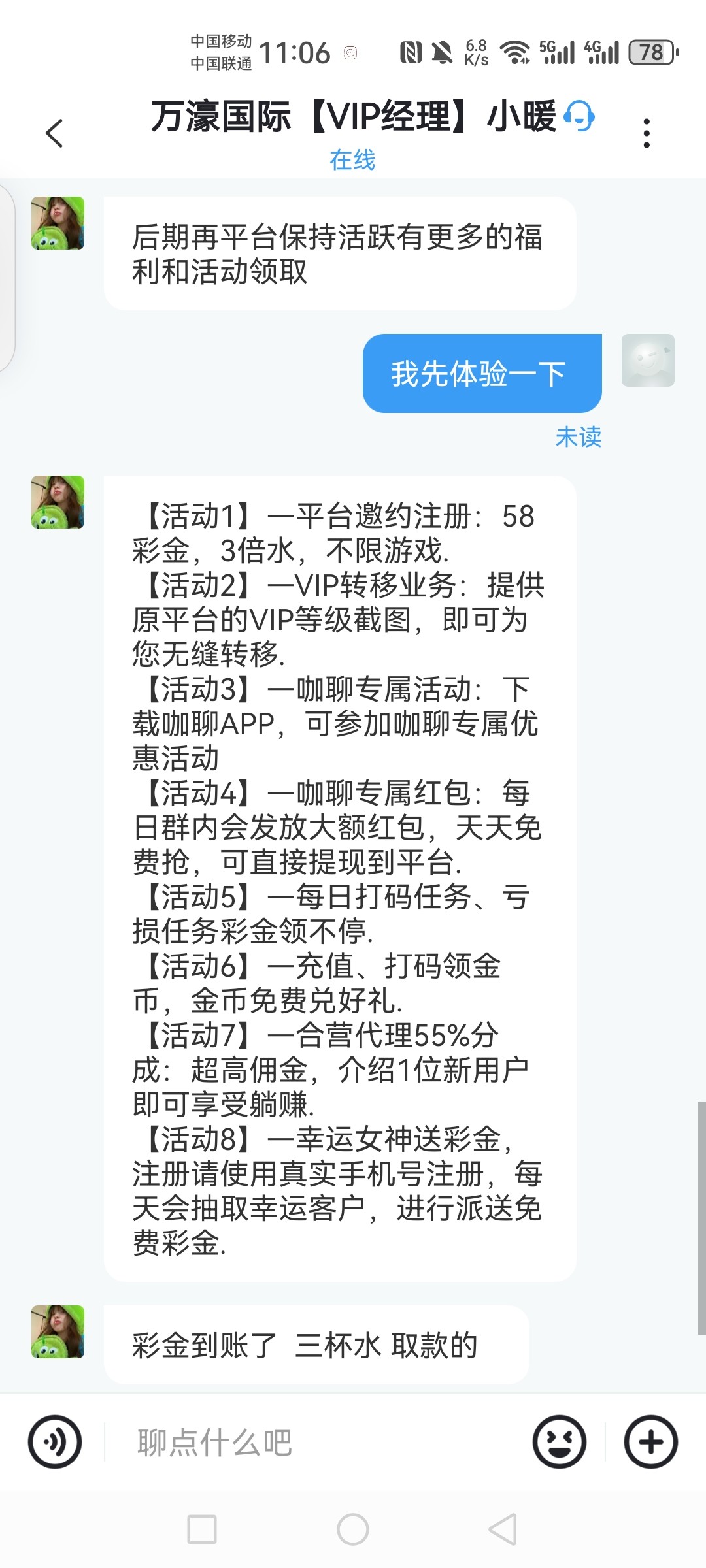 碰瓷58,3倍水提款,先去网站发给客服手机号,看看是不是特邀。就说打电话过来的,2229741.com,如果是特邀,他会给你网址,让你注册,注册好,会让你下载咖聊,kachat999.com