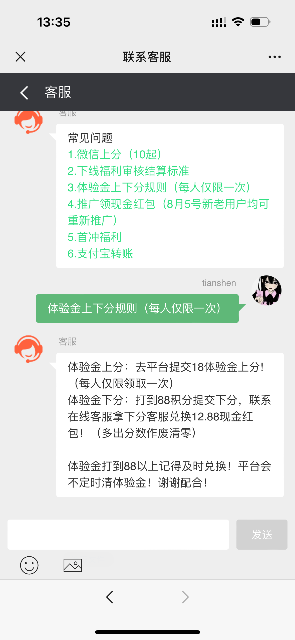 微信扫码点充值有个体验金通道提交18打到88下分12.88现金
