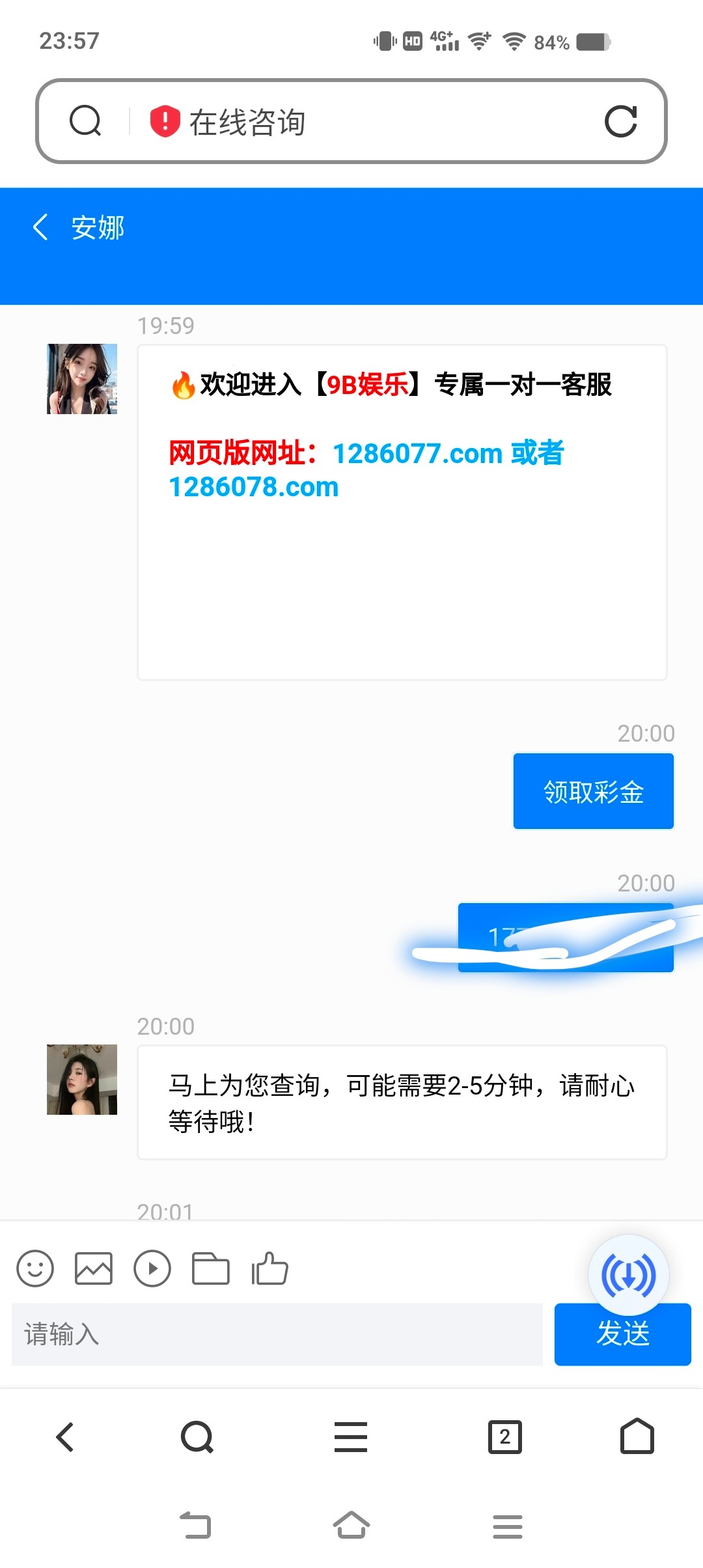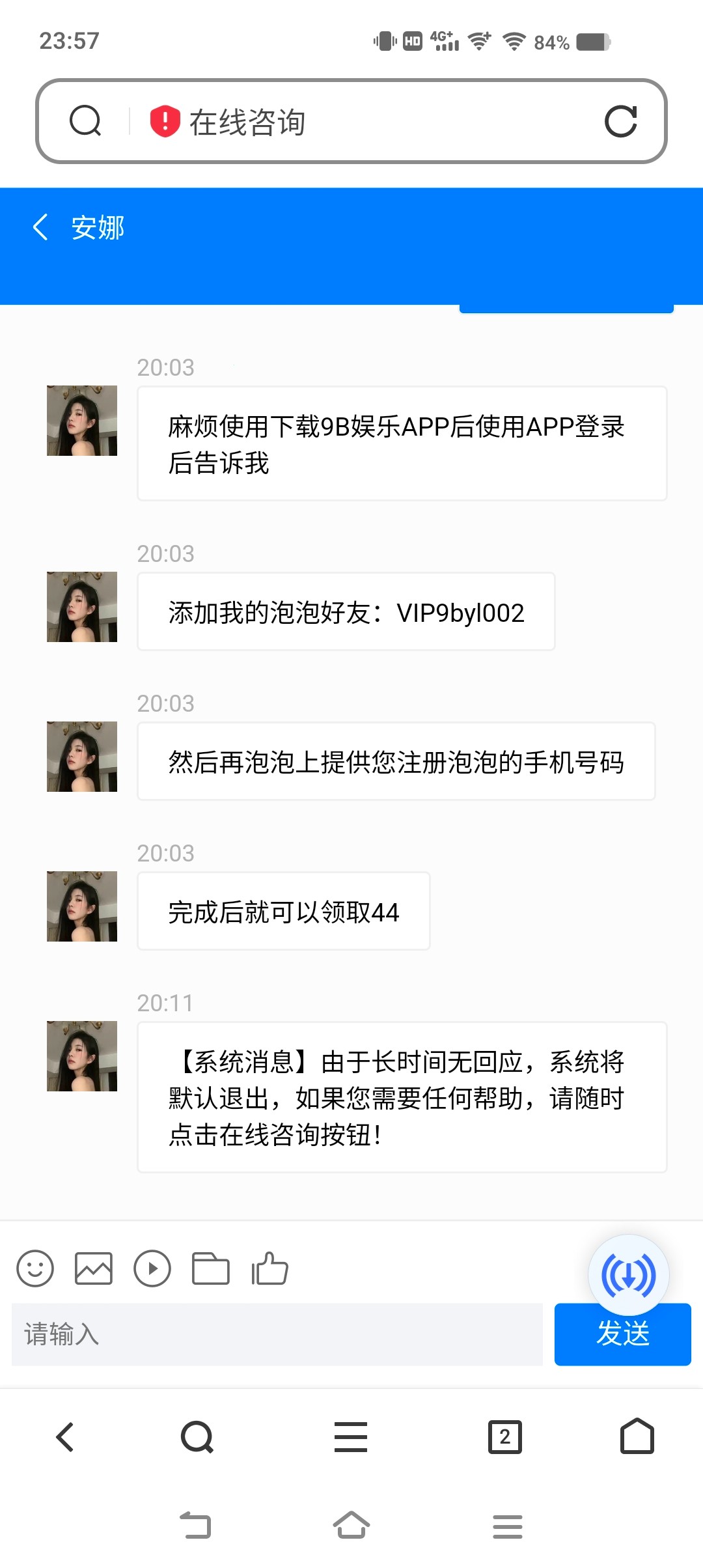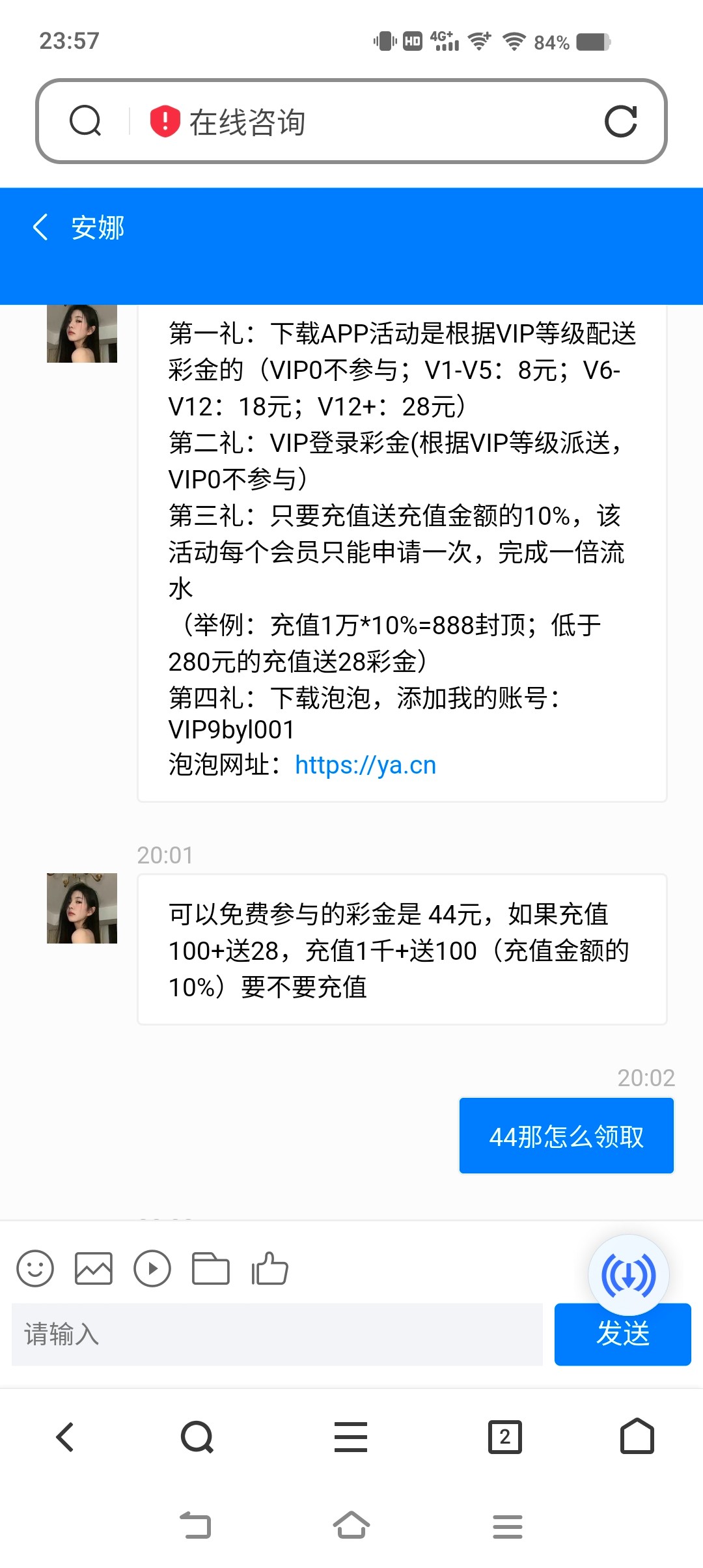 前段时间9b特邀送了188的。今天打电话来说有44彩金活动。领去过188的可以去找客服。给客服说44彩金,客服会给泡泡下载网址和添加泡泡号。记得泡泡注册登录也用9b的手机号。网址:1286038.com,点击客服,选择第三个1v1专属客服。我多ip出了200,另一个号不是特邀没送.提款很快.