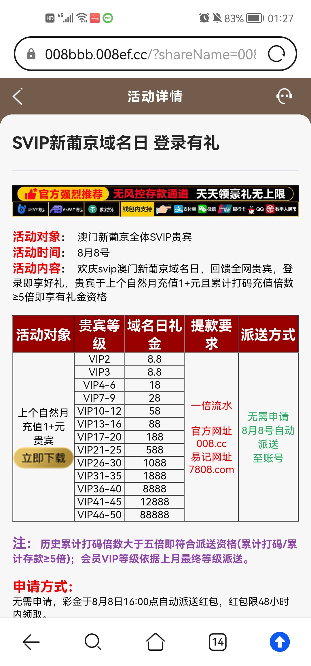 没等级的无视,具体看活动规则,登入就就弹出红包一共两个加起来十块 网址 008.cc