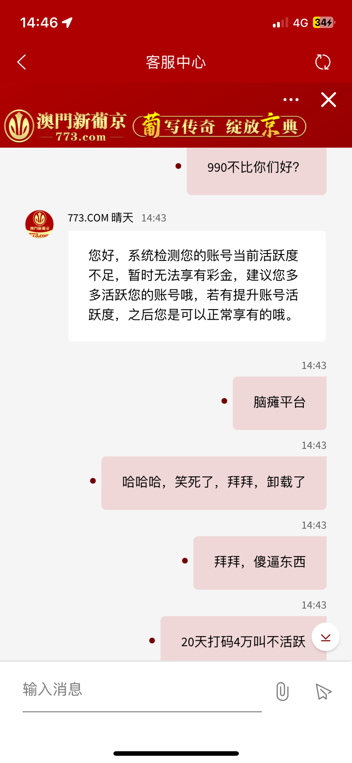 玩773的别玩了,20天打码3万8,余额300块钱,不给提现罚5倍水,说账户不活跃,20天打码4万说不活跃,本周打码2万多,说不活跃,哈哈哈,牛逼平台,还在玩的自求多福吧,搞不好那一天赢个几百块钱,说你账户异常