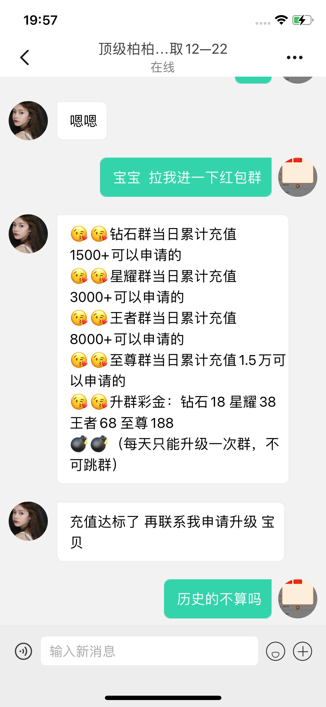 根本不行,问过顶级和K1专员了,顶级当日最低充值1500进钻石群,K1本月充值1000才能进群