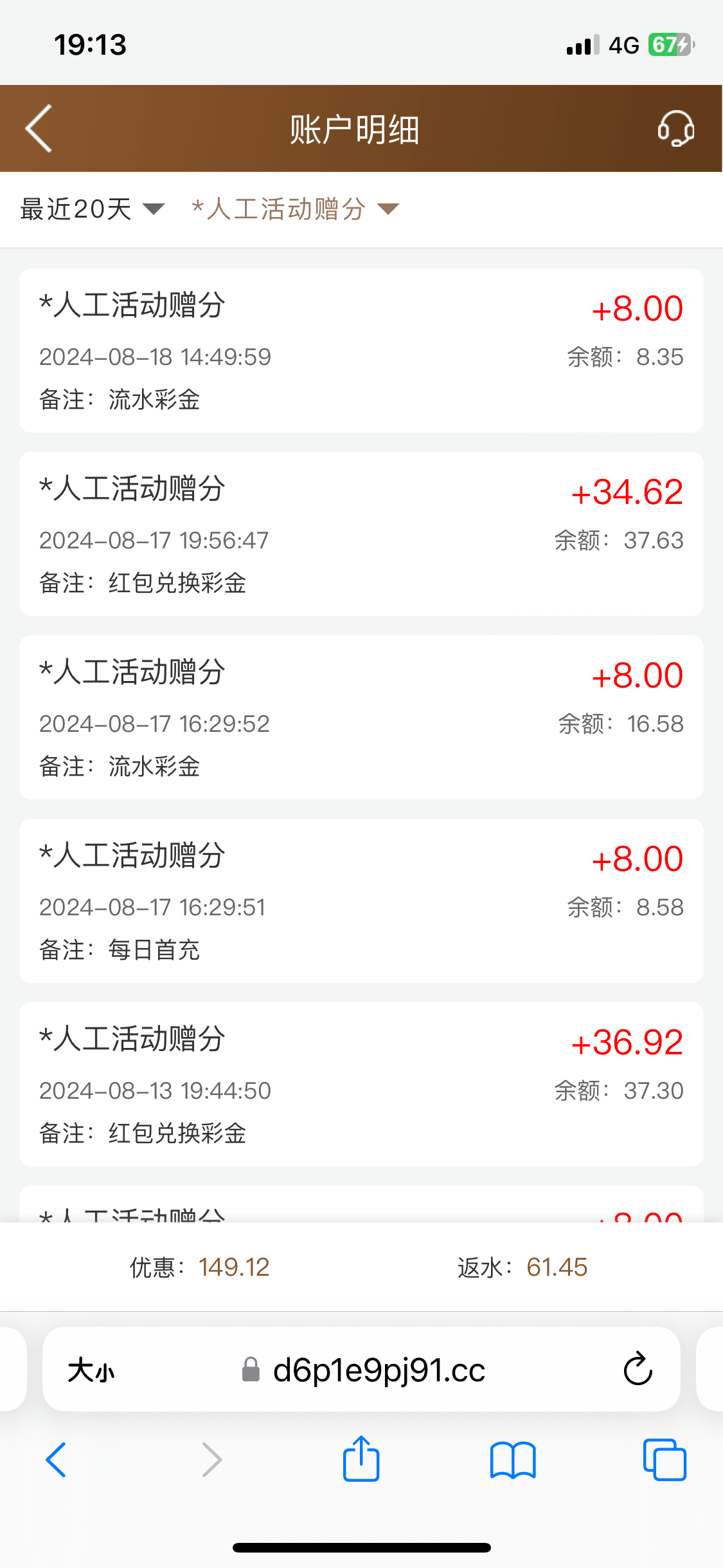 起风了 ▶ 起风了 顶级系列台子,玩了三年多,最开始是在顶级的星耀群,天天保底都能抢个五六十,后面莫名其妙把我那个一起聊的号封了,索性就没怎么玩顶级,改玩(天庭鼎盛35273跟去年年尾出的一起玩)这几个台子。红包这几年没细算,大概也有四位数了。今年顶级系列的台子都不主张充值玩,主要去年六七月份挂壁我把顶级系列的台子该p的都p了,虽然基本无恙了,但也不敢充值玩。今年在顶级系列的台子总充值加起来也没2k。那个软件里还有207红包,懒得动它。每日群红包都懒得抢! 2024-8-19
