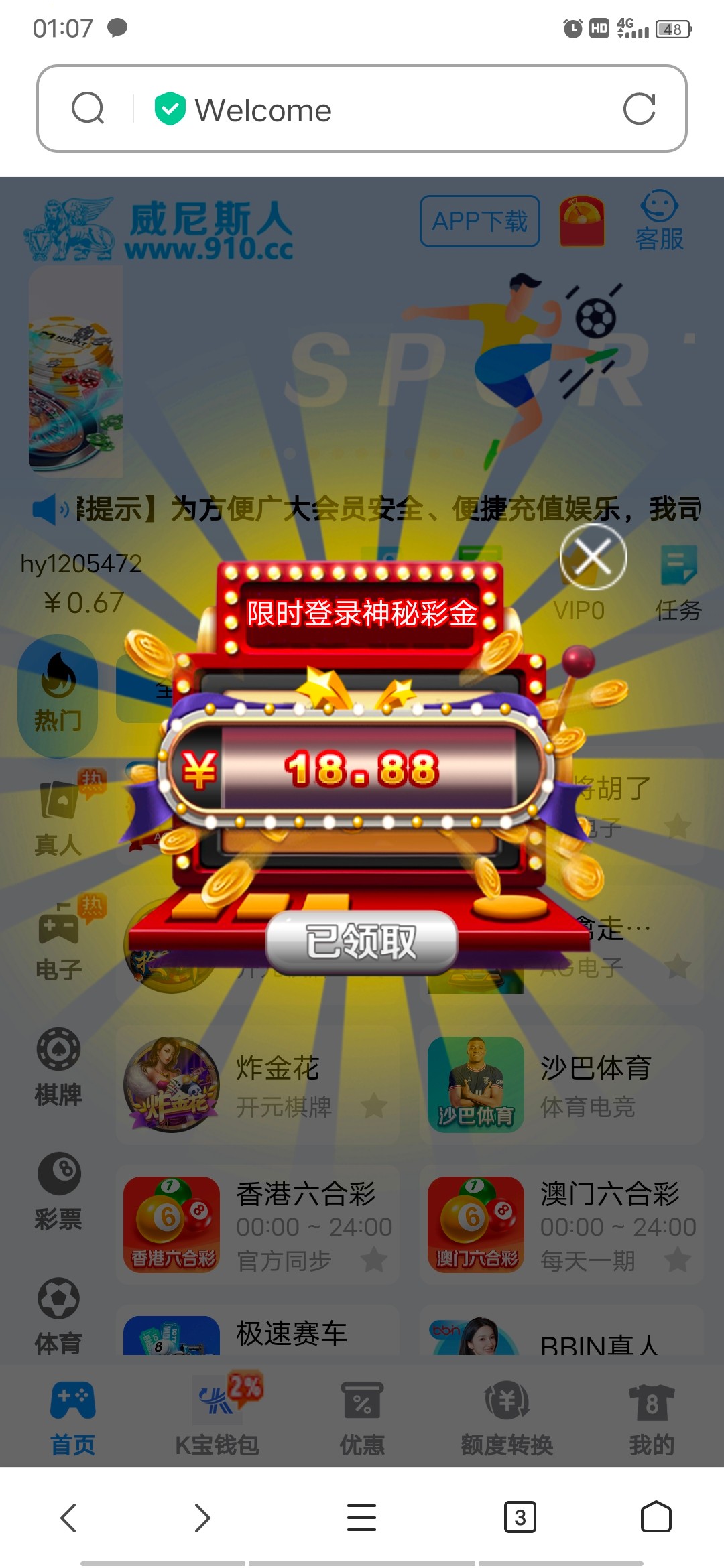 有号的可以上去看看,限时登录神秘彩金我领了18.88 910.cc(禁止充值)