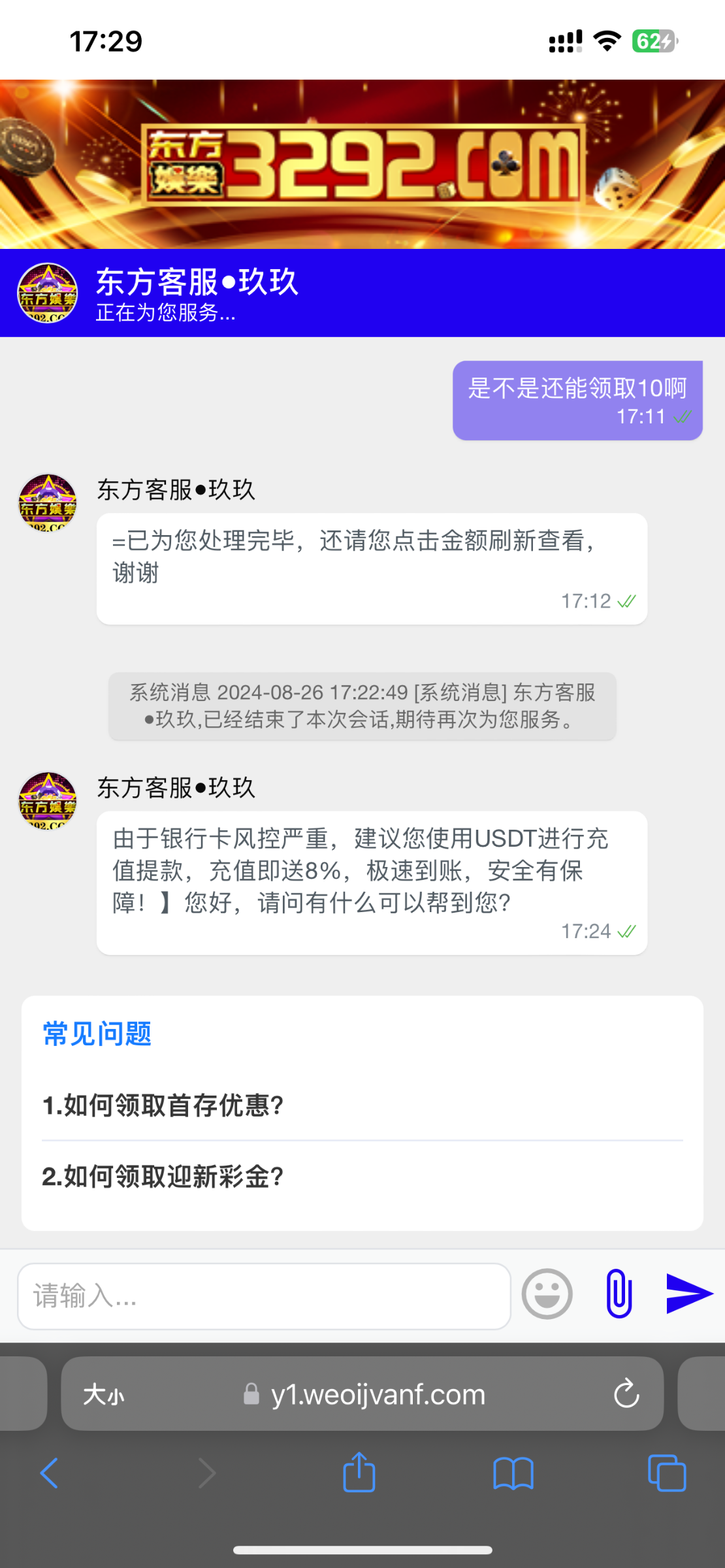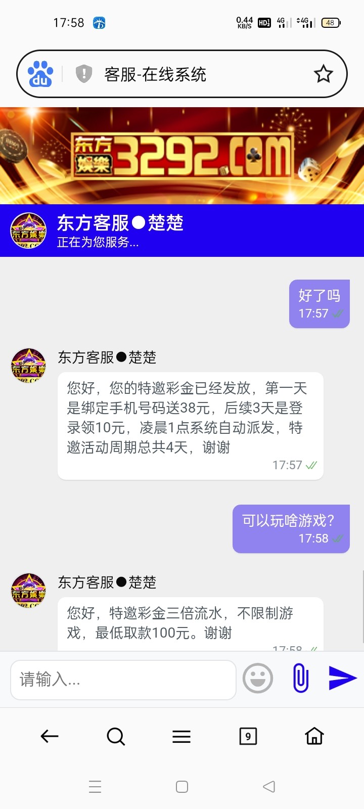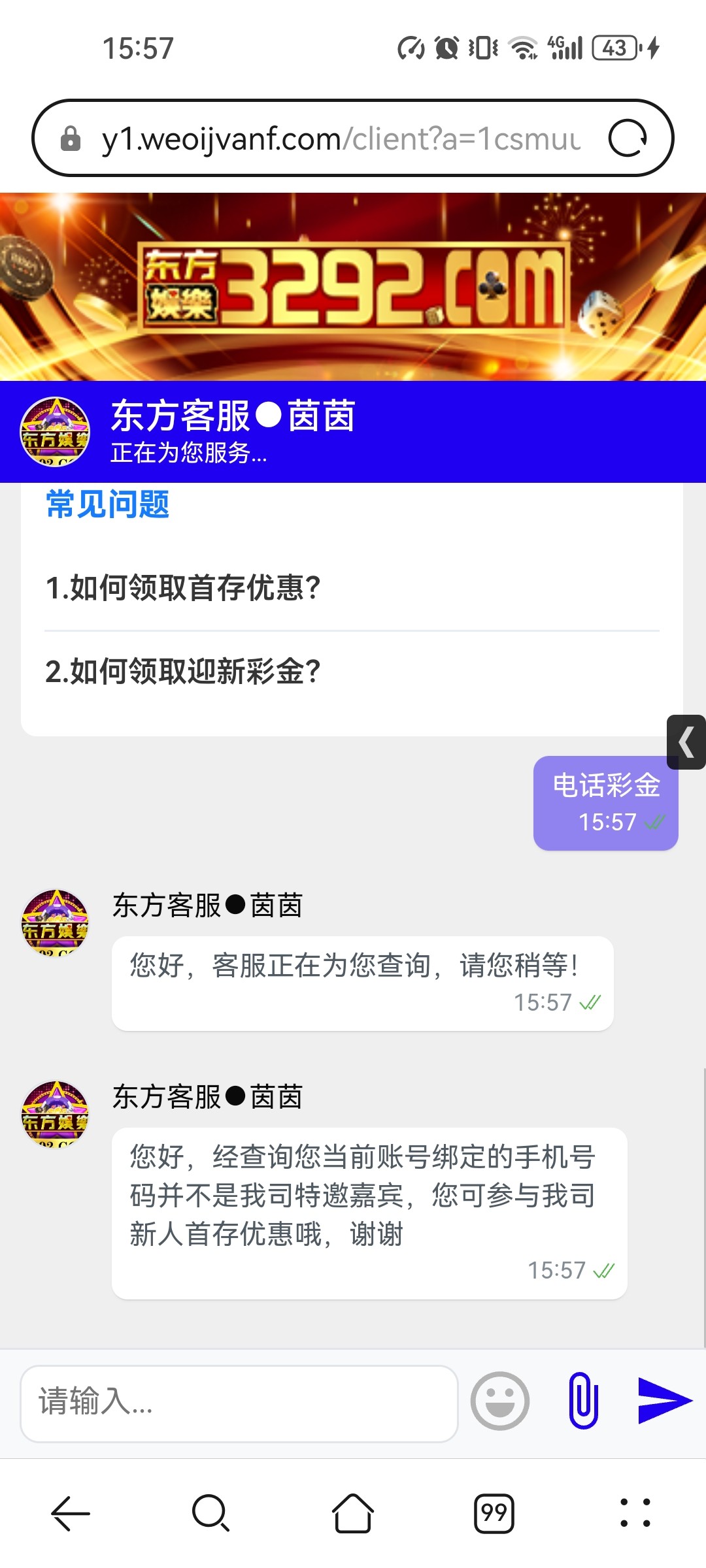 新用户无视,我去年注册的账号 刚刚登录找客服碰电话彩金 直接就给了 没有来电话 3292.com