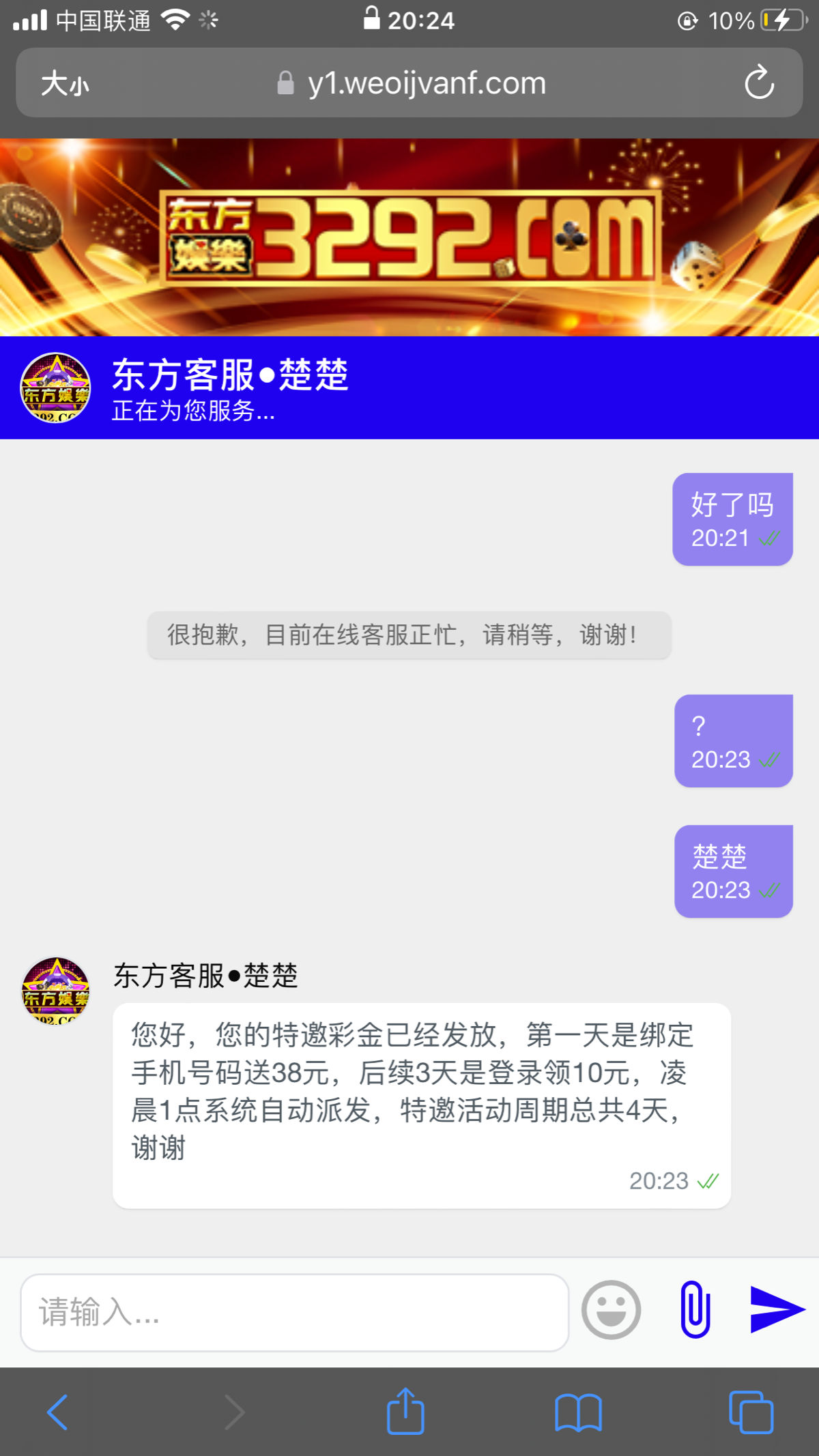 第二天找客服领到了10