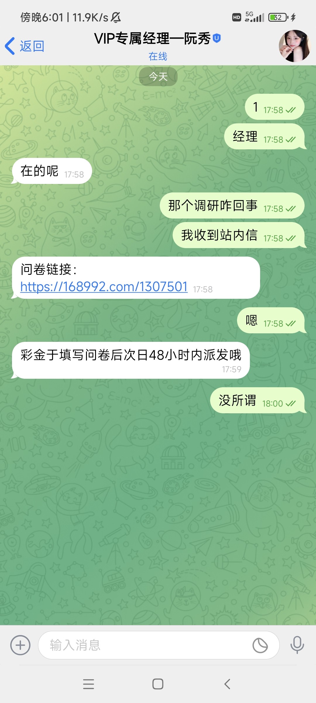 jh1717315 ▶ kk168168 @kk168168 ,哥能发下问卷链接吗 2024-8-30