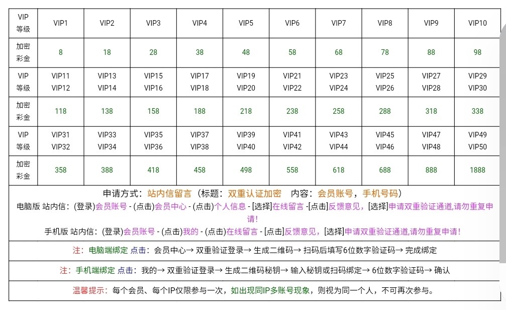 新人无视 老用户有号VIP1以上的去绑定双重认证彩金 集体内容看下方图片 ↓我申请到了第二天领取的 注意标题:双重认证加密 内容:会员账号,手机号码