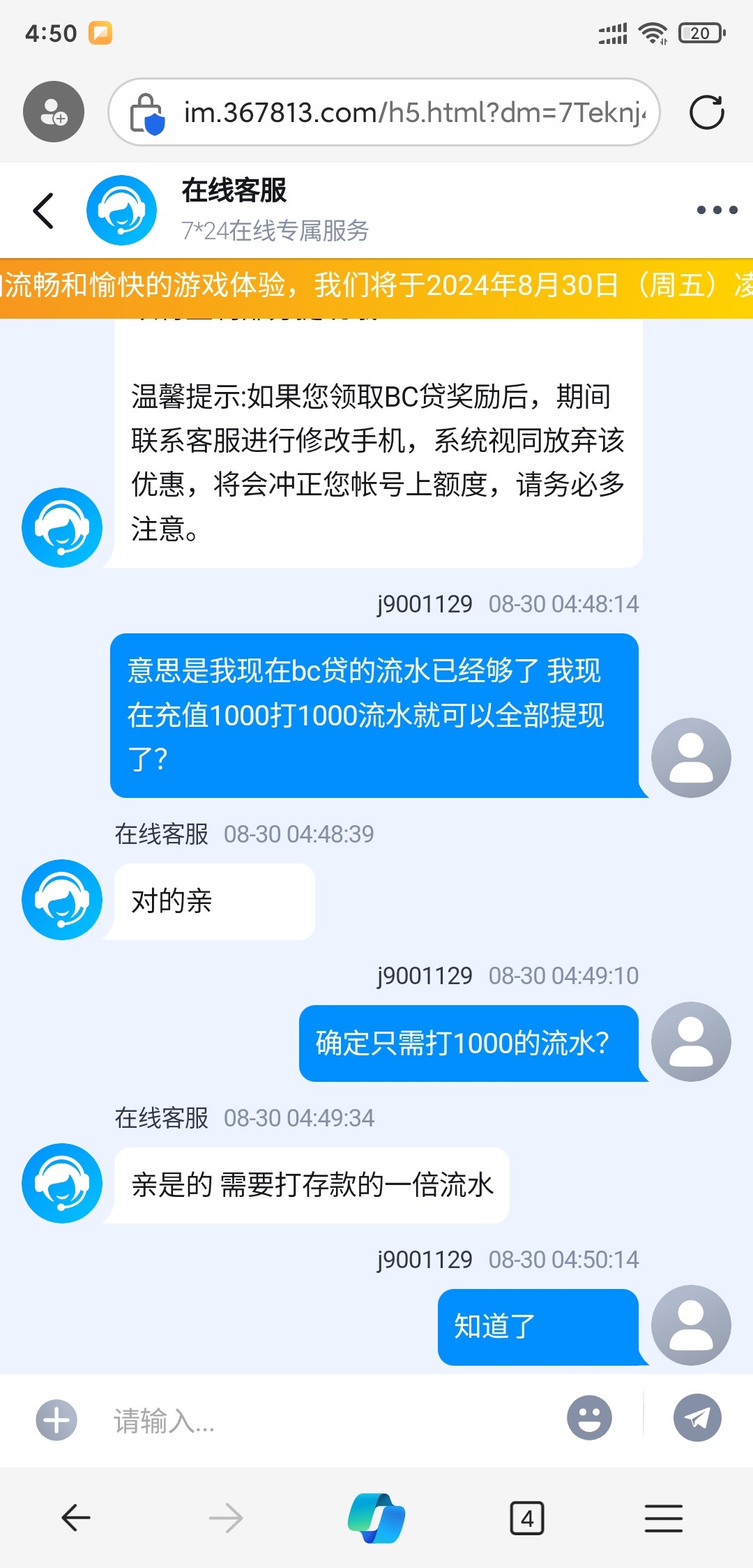 我申请的bc贷九游的 客服告诉我要充值1000打1000的流水 我现在bc贷的5倍流水已经够了 充值1000是只打1000的流水吗?有老哥懂得吗 ?(出了安排华子)