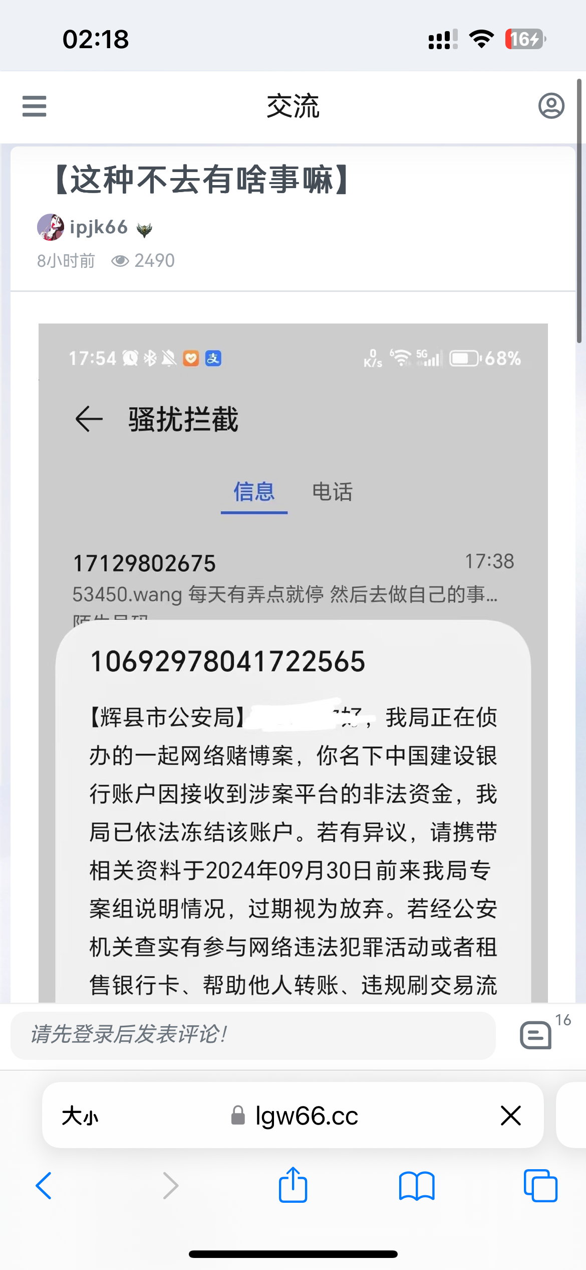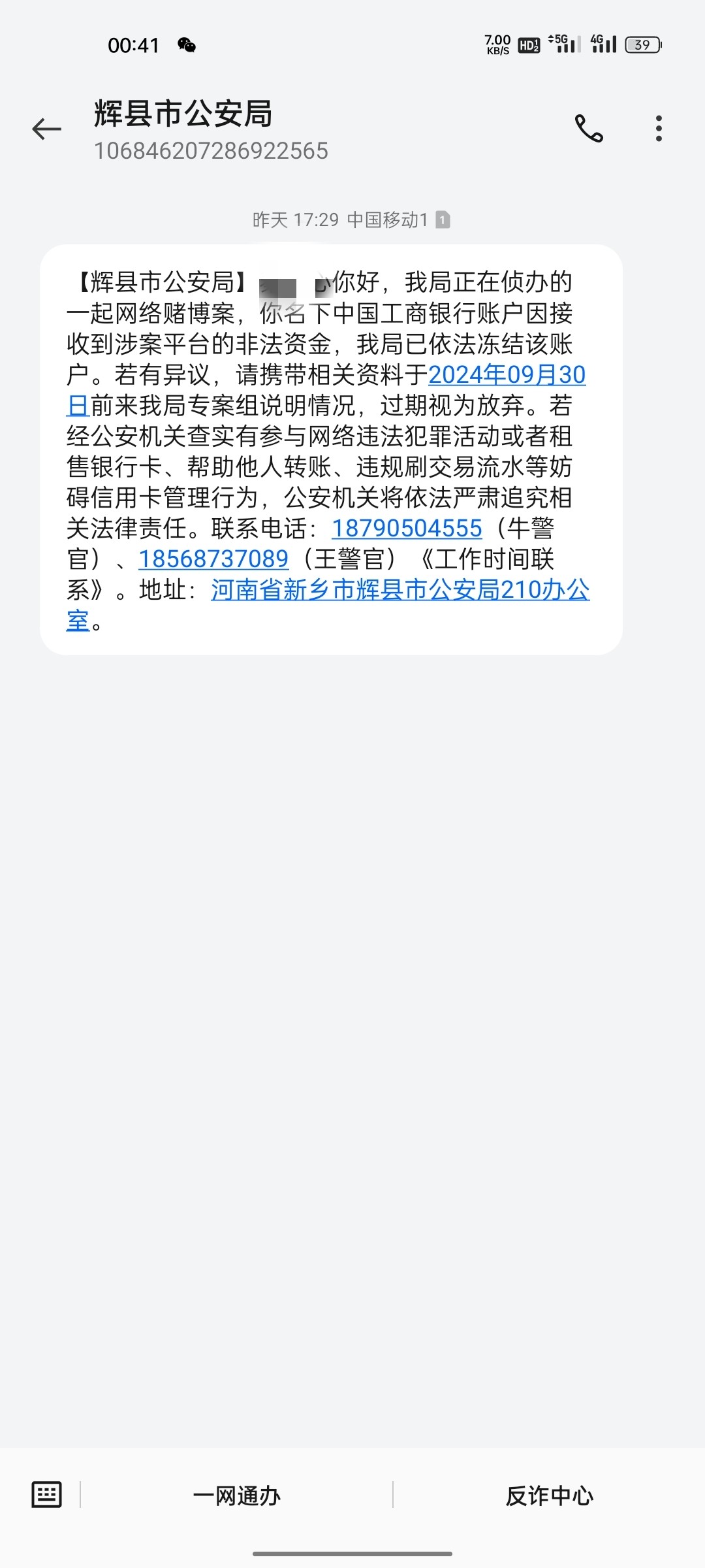 你这个怎么根上面的老哥一摸一样,别被诈骗了,先别管吧,说实话没见过直接把帽子叔叔电话直接发短信的