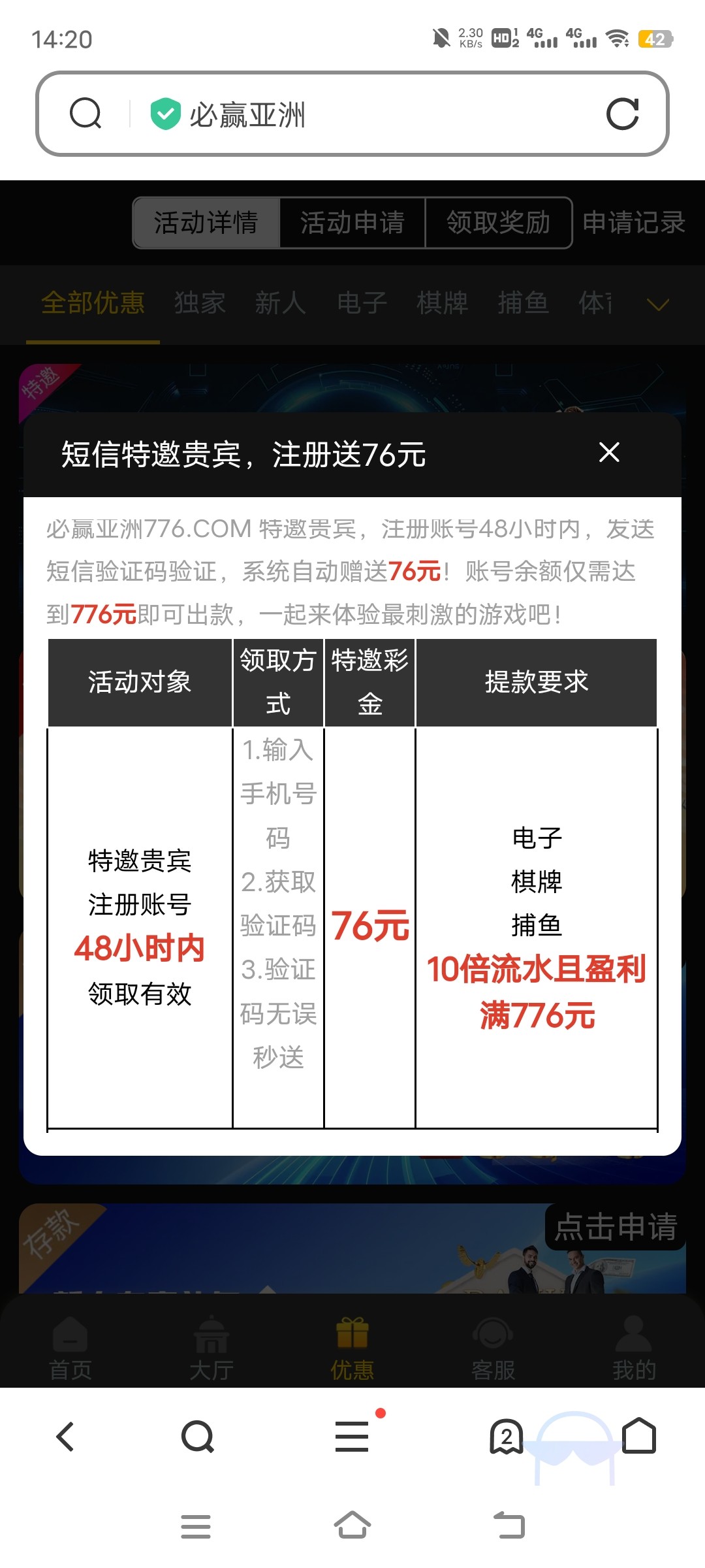 注册在优惠找到新人特邀,输入手机号码能收到验证码就是特邀,不知道是不是重置了,我刚领取到,地址 776.com,精彩网系列大多数重置特邀了提现都多ip非法盈利扣除,想玩的可以去看看,白嫖就行了能出就出,出不了别哔哔赖赖的