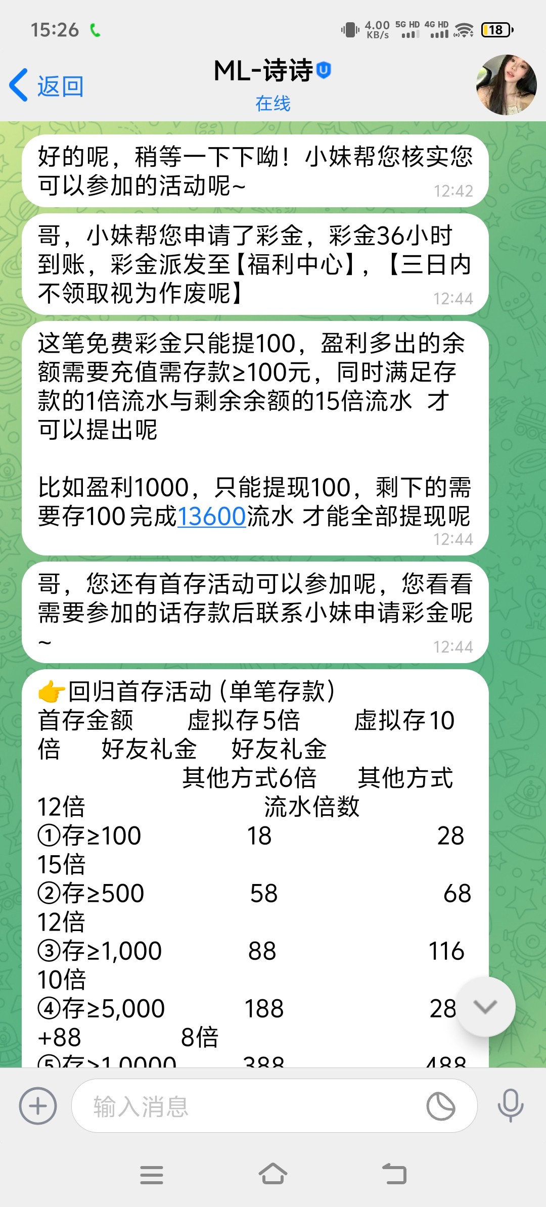 今天送了老用户回归38彩金,打到了一千多提了一百到账了,剩下的要充值一百以上打15倍流水才能提,想问一下老哥们这黑不黑有没有试过这样的