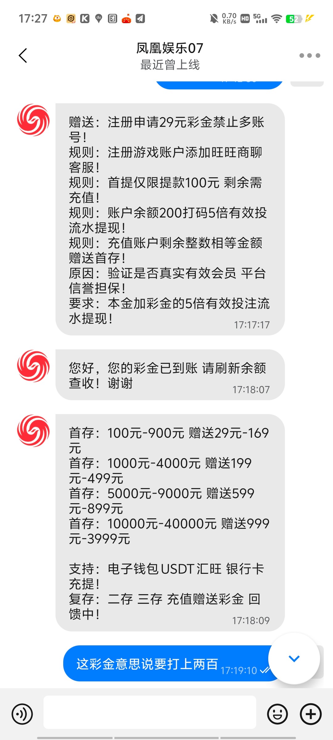 要加旺旺,这人才台子规则多,29彩金要先打上200,然后再打5倍水,才能提现一百,剩下的需要充值同等金额,我的是送了,打不出来