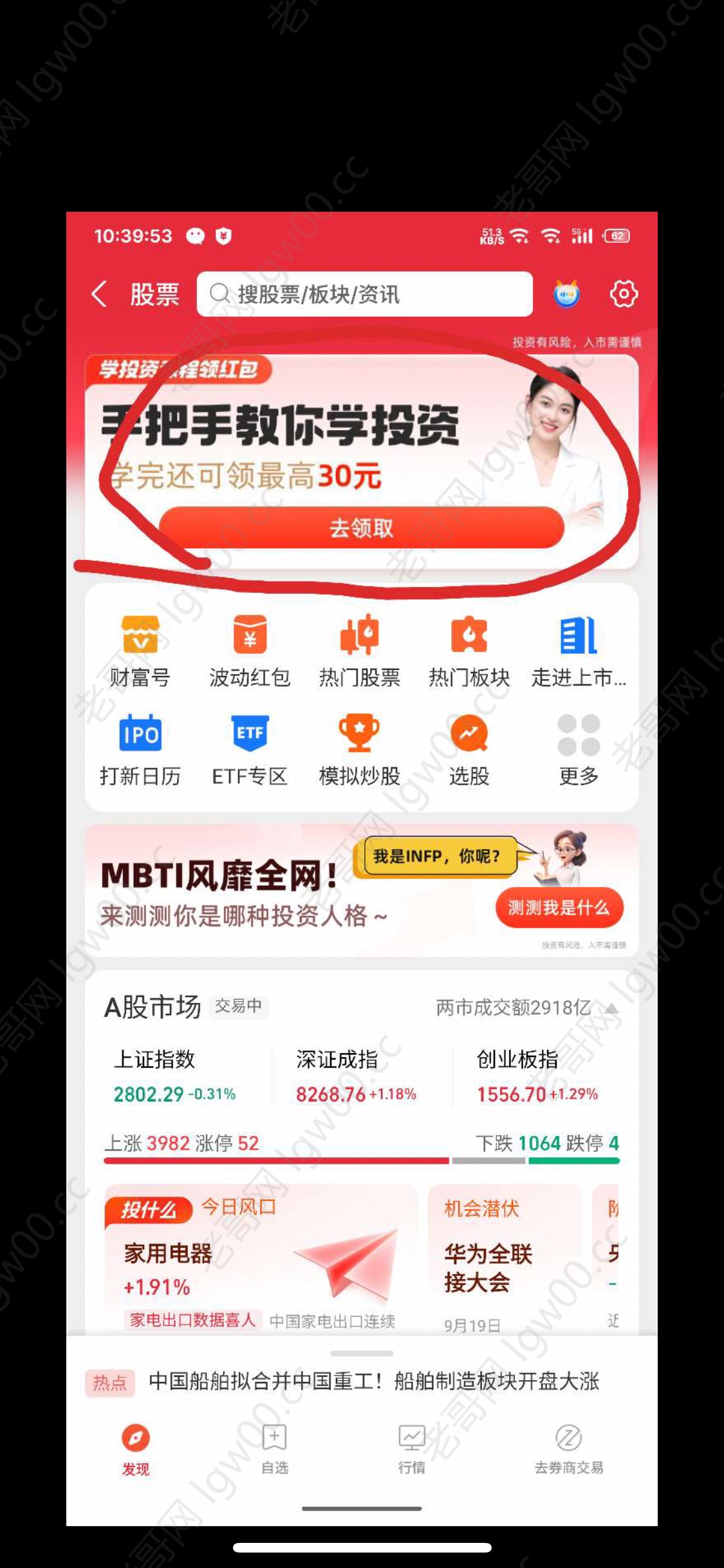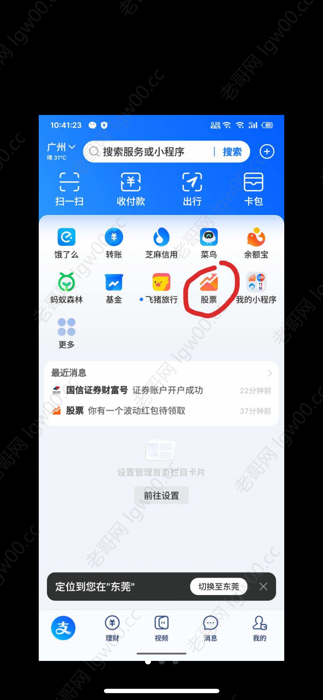 支付宝首页股票 学投资教程领红包 只开户不用买股票 开户成功看三个视频即可领取。我成功领到22.8然后充值送给狗庄了