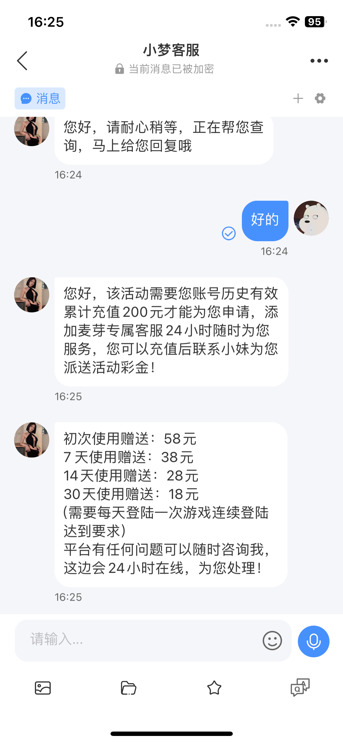您好,该活动需要您账号历史有效累计充值200元才能为您申请,添加麦芽专属客服24小时随时为您服务,您可以充值后联系小妹为您派送活动彩金!