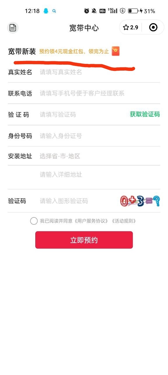去微信搜预约宽带红包第一个,然后点击小程序进去填写信息,每个人都有4块,每天有限,领完为止,有就有没有就没有,大家可以去试一下