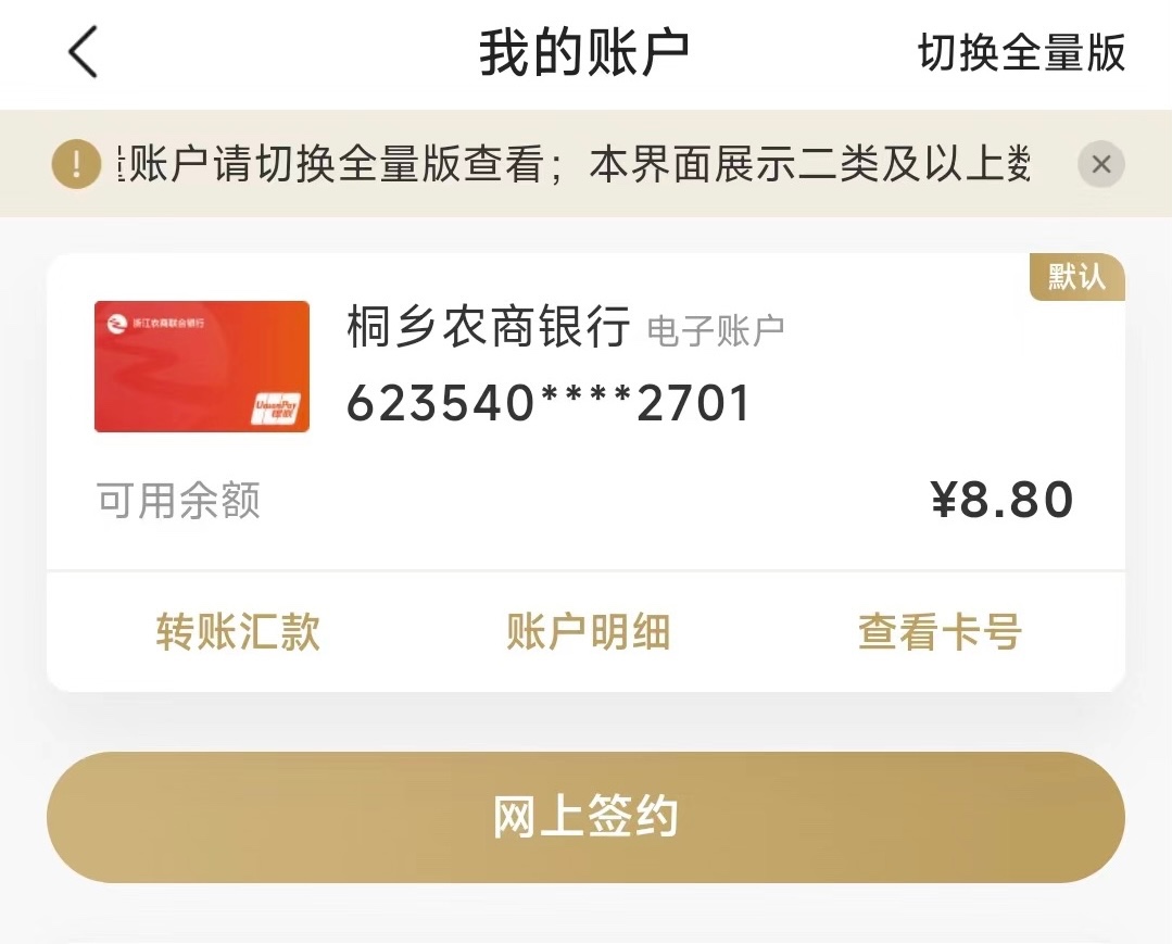 下载注册丰收互联app 主页改定位 定位到浙江省的嘉兴 桐乡市 点击我的账户 开通电子账户 选择开户机构嘉兴市桐乡市农商银行 点击财富账户下面的选择更多类型 会出来一个电子钱包账户(本条最重要:切记千万不要选财富账户)绑定一类借记卡,开通桐乡农商银行三类电子账户 领取8.8元红包 点击转账 输入卡号 将8.8元红包转账至绑定的一类借记卡 流程结束 可在智能客服里面注销三类电子账户 领到的老哥留帖谢谢