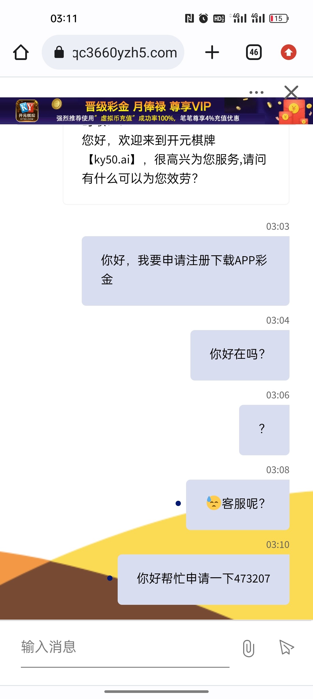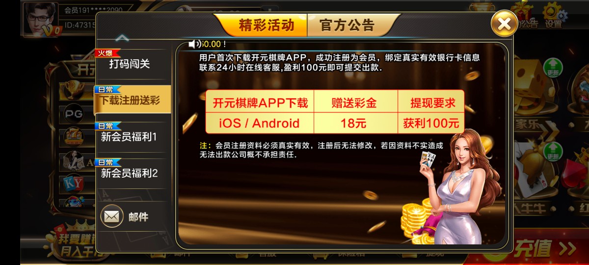 没有撸过的老哥上,撸过的请无视,亲测领到了,注册绑定银行卡,手机号。确保信息无误!然后直接找客服申请app下载彩金!我没打出来!无游戏限制。最低提款100!ky50.vip 919.vip