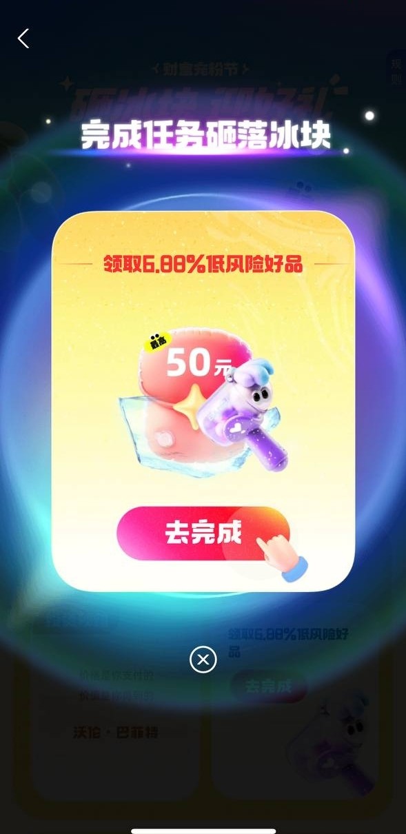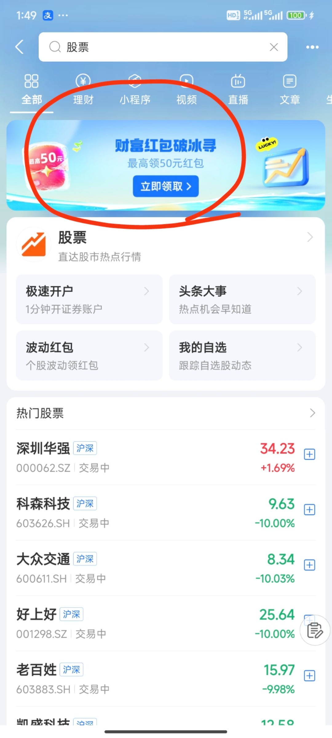 跟上次有个兄弟的一样 支付宝搜股票有个砸冰块活动 按流程开户就有50消费红包 可以套的 上次做过那个看视频的好像不行