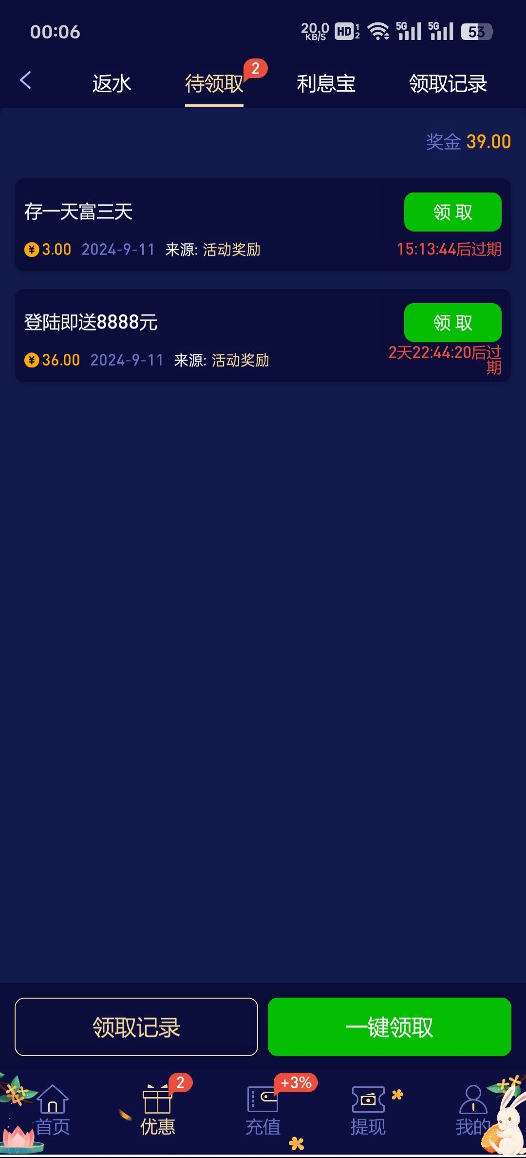 没充值过的领取后打上去了要充值余额的一倍,有充值过的打上去了可以直接提