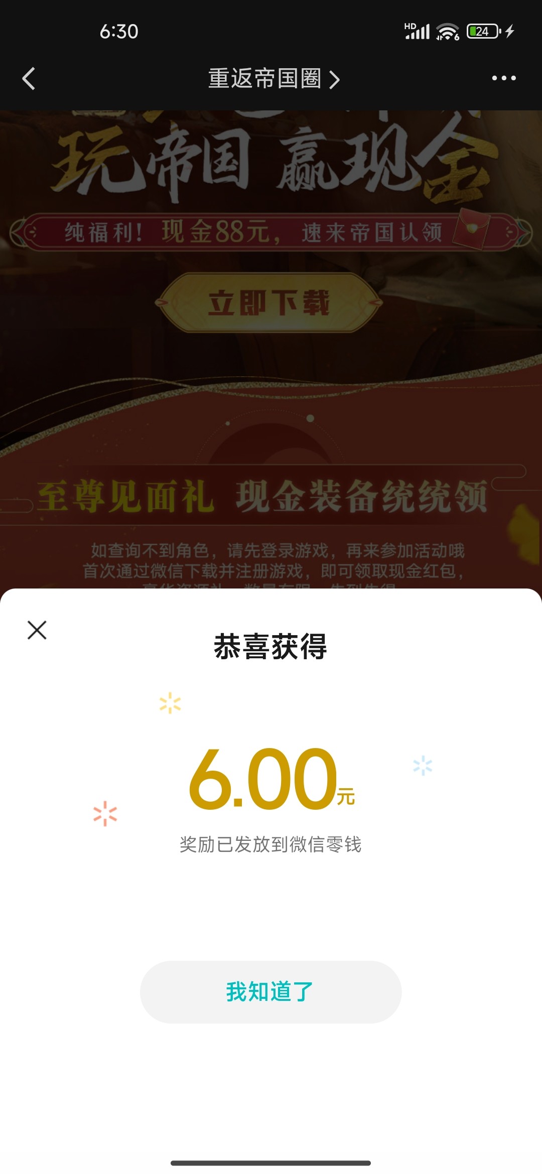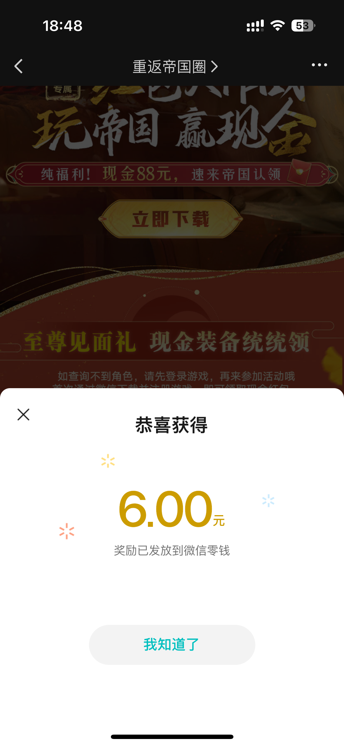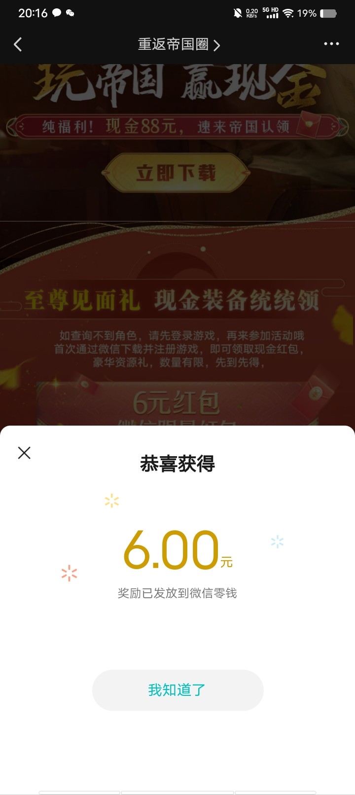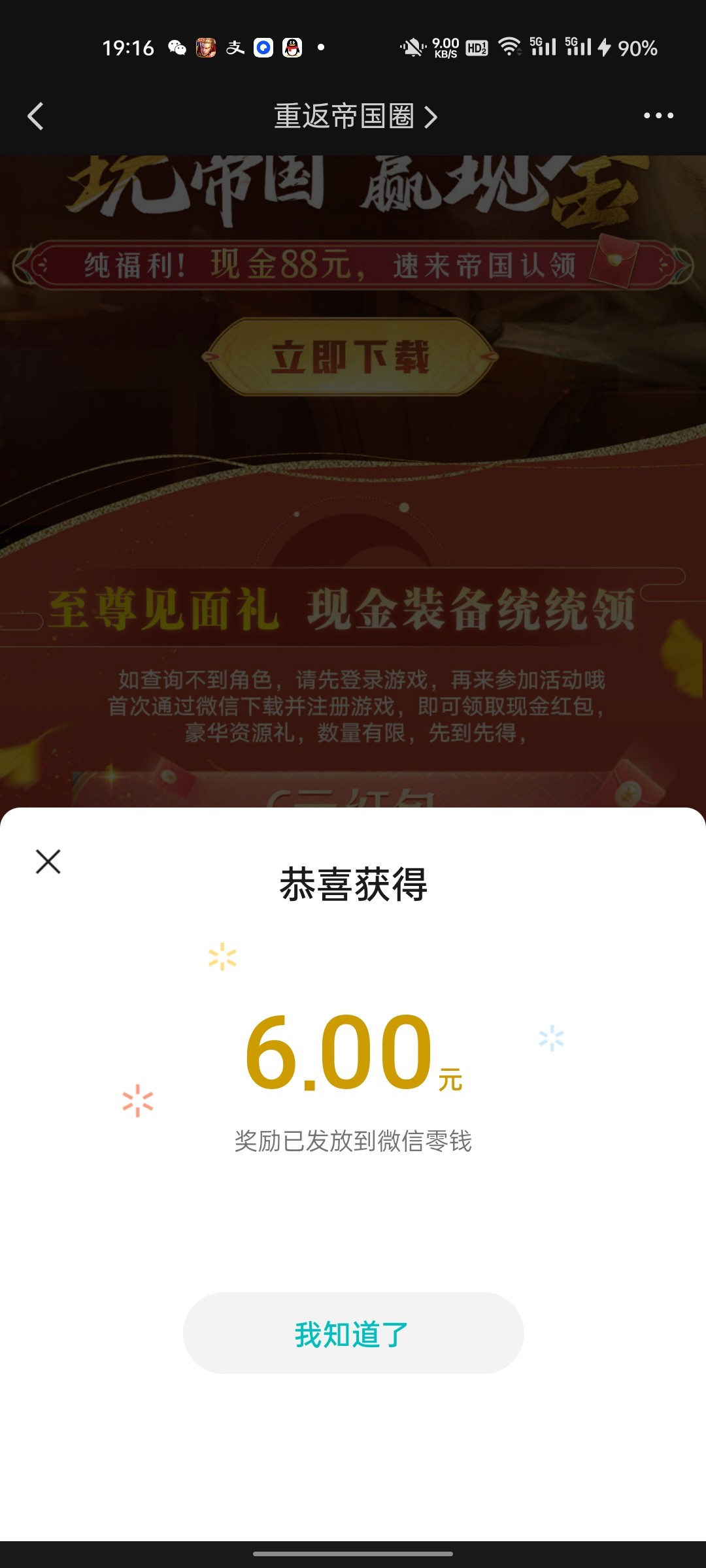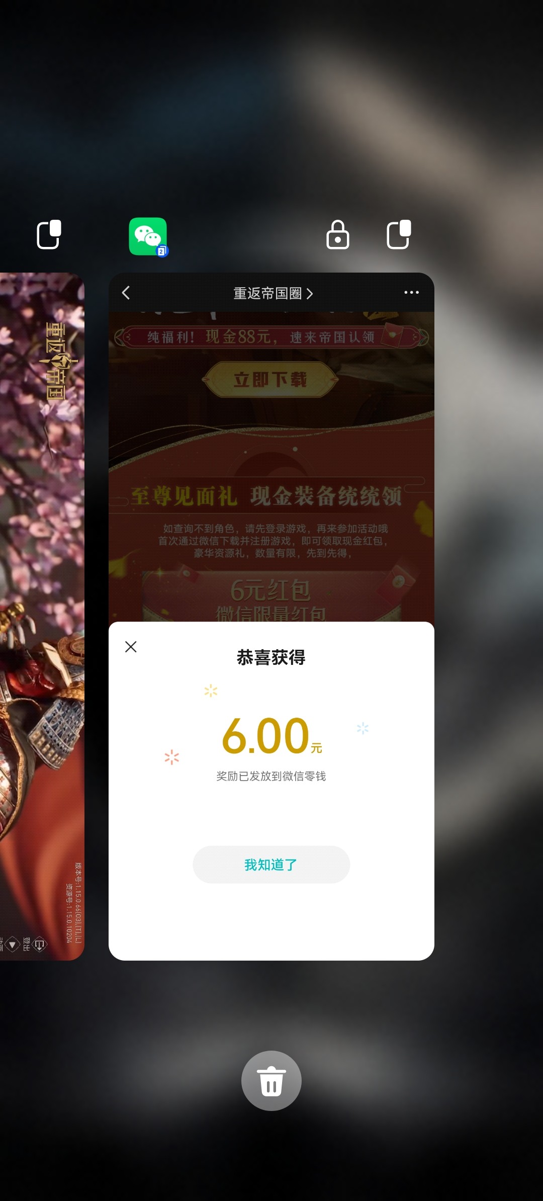微信搜索重返帝国俺图示点进去,再点击福利然后点击齐聚帝国 共赢现金,下载注册一下就可以了,一定要在活动页面下载,不要去应用商店下载,多号多撸,做好一个号记得卸载,