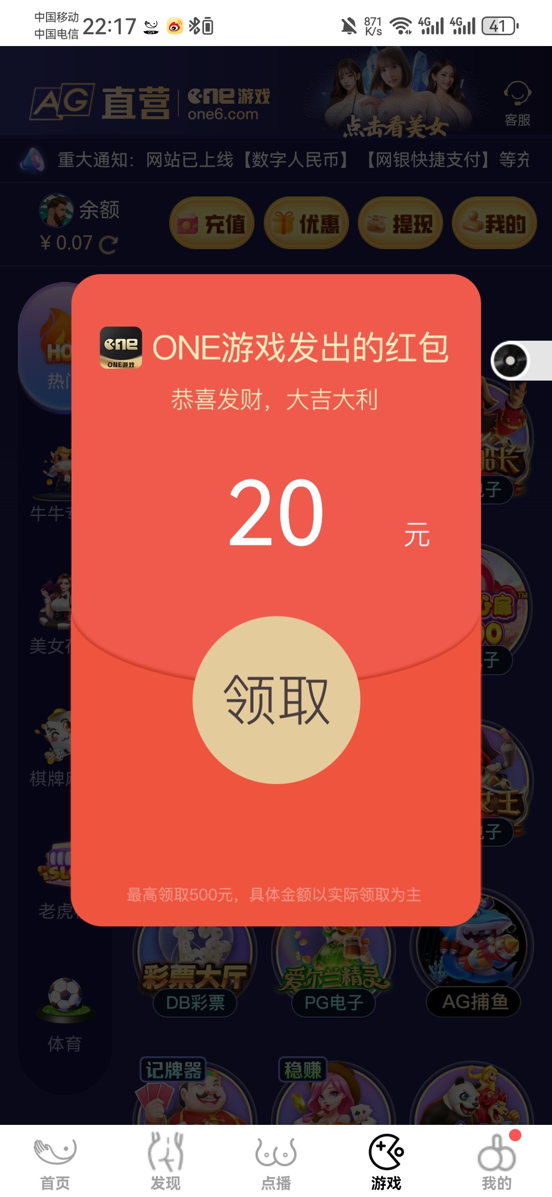 黄软,进去弹出红包送20一杯水,到自带one游戏里领,不知道能不能出,提现自测,我两天都领到了 地址 one6.com