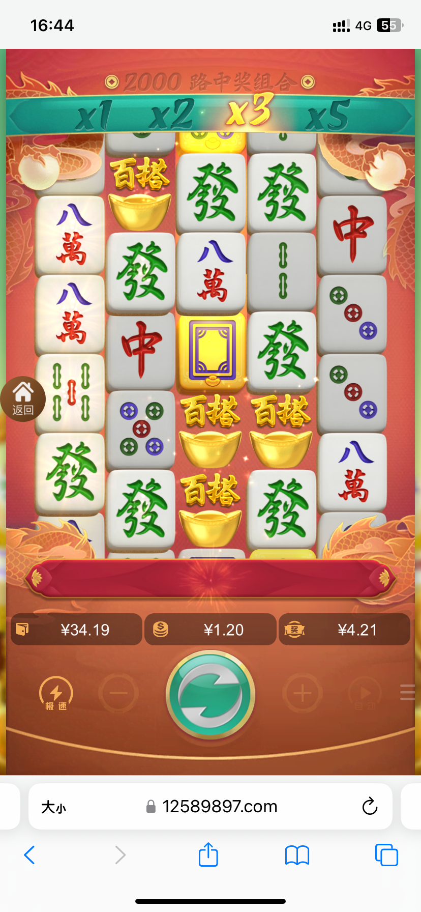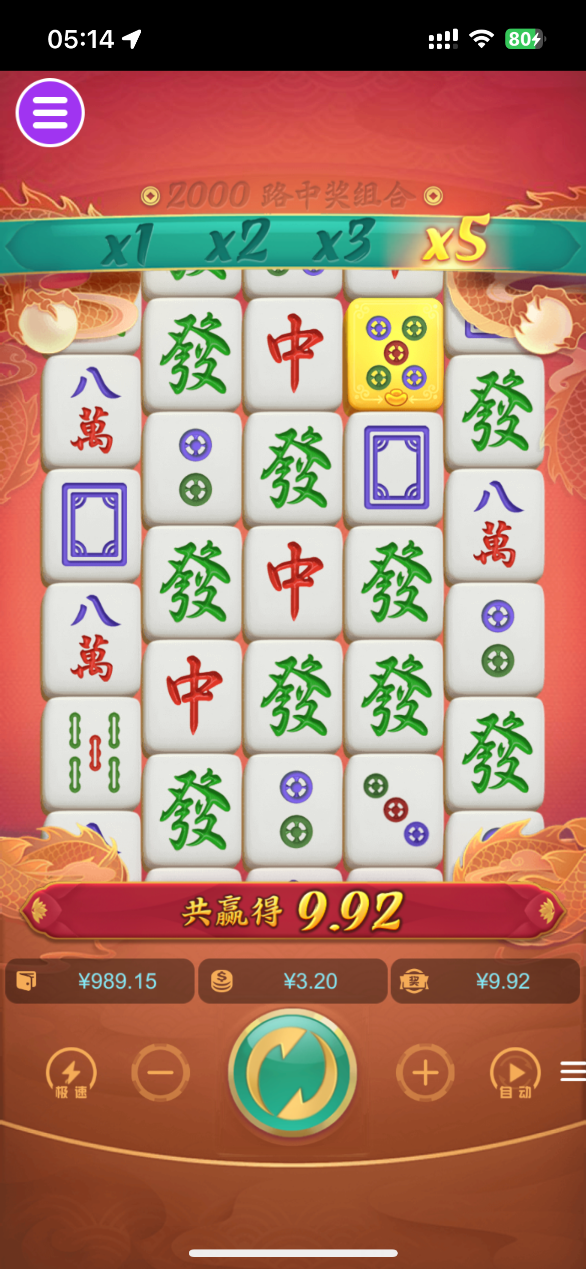 如果第一排来个二饼再把上面两个发财掉下来,一共是200倍乘以五连发财,只是第一排下来一个发财的话是120倍乘以五连发财的钱,五连发财。3.2的五连发财应该是8块一个,最多也就1600,五百倍多点