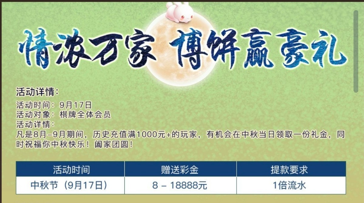 中秋节历史回馈彩金,老玩家8-9月充值1000以上的有8~18888可直接提现,新用户有绑定彩金 官网 1616qp.com