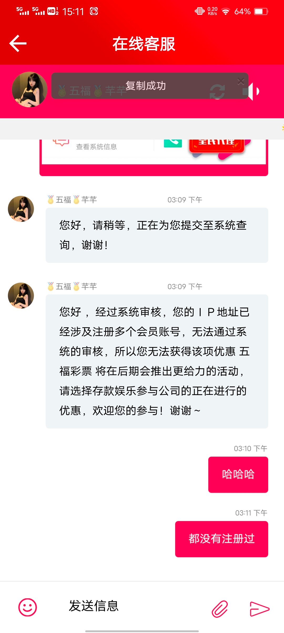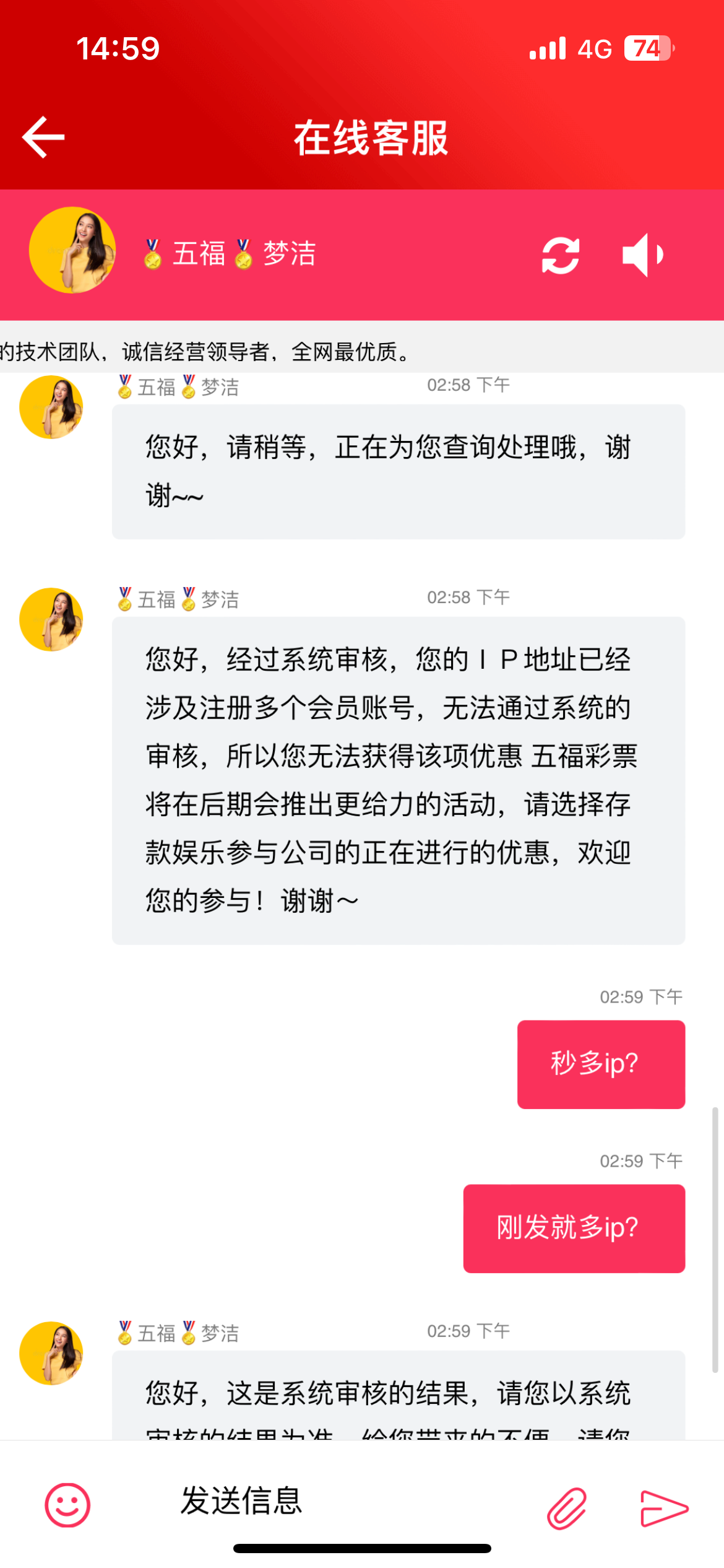 累计充了100万+,可以领1888晋级彩金,申请晋级彩金时,客服找各种理由说一倍打码不参与优惠,我打码超过5倍了,近3个月累计充值46万,累计彩票打码206万,都是玩不起的平台,垃圾