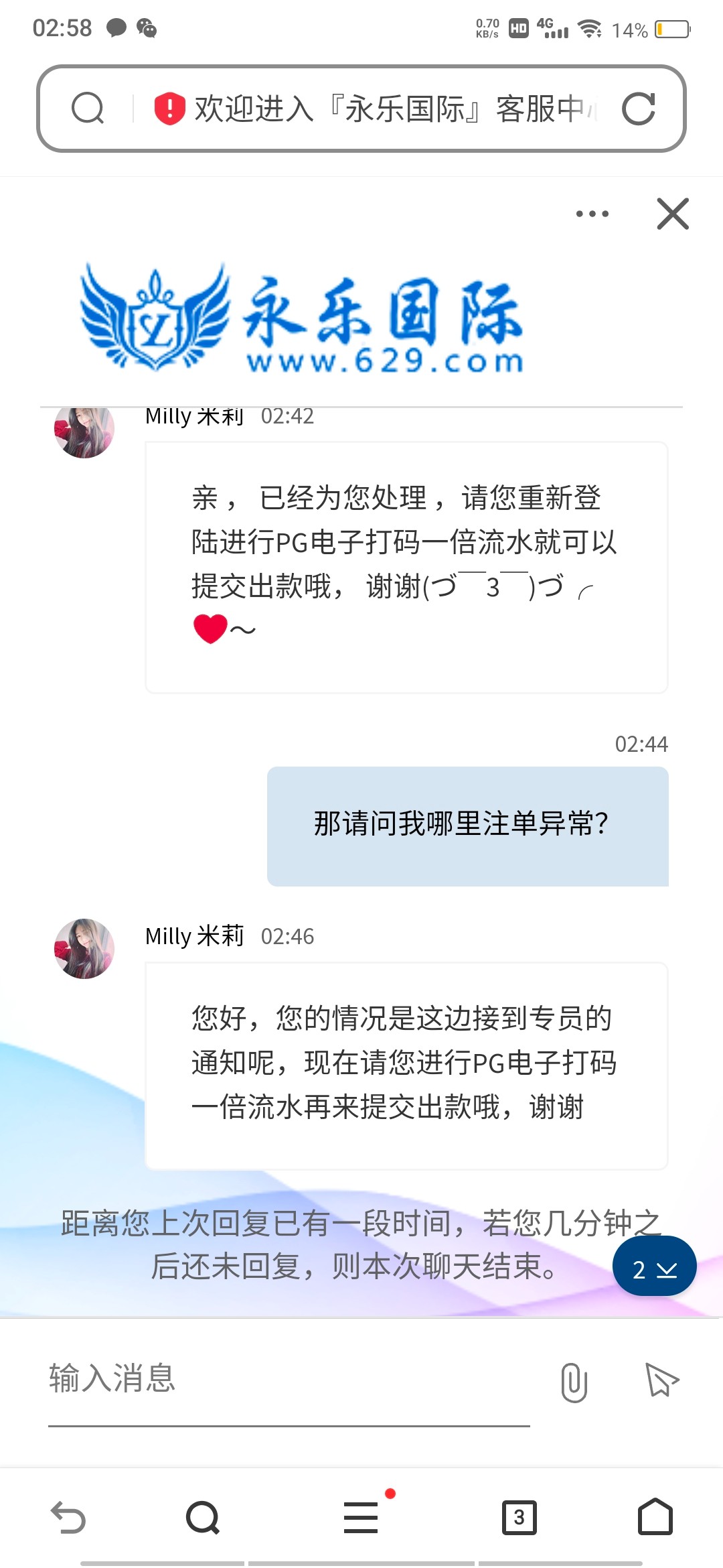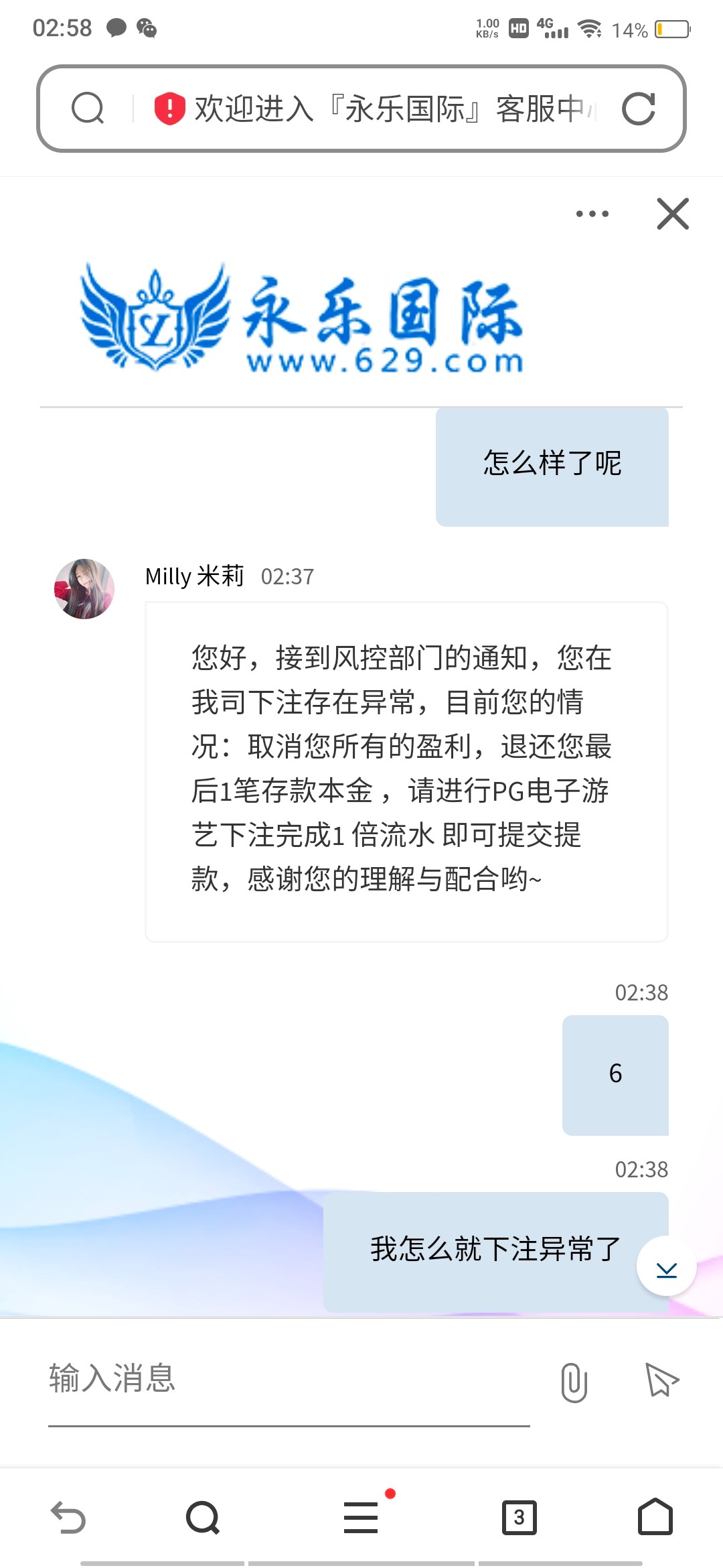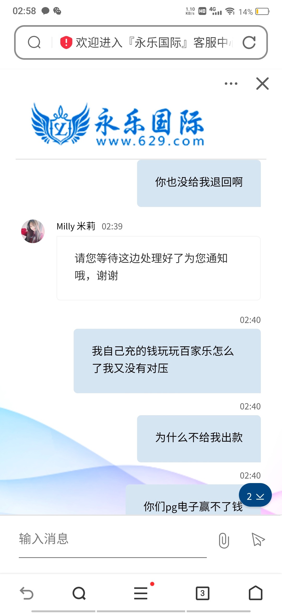 是这样的,这个平台我自己充值100块钱没有申请任何优惠,赢到300,下注了百家乐提现半天硬是不到账咨询客服以后说我注单异常,问哪里异常了也说不出来个所以然,修改个提现密码骗了我一大堆资料,然后说退回本金让pg打一倍流水提现,然后100硬是上不去,这个平台格局真小,出款300块钱都出不起,以前有玩的和以后想玩的注意避雷,这100块钱就当给各位老哥避雷了